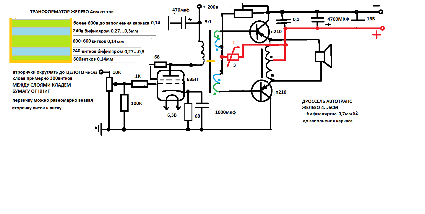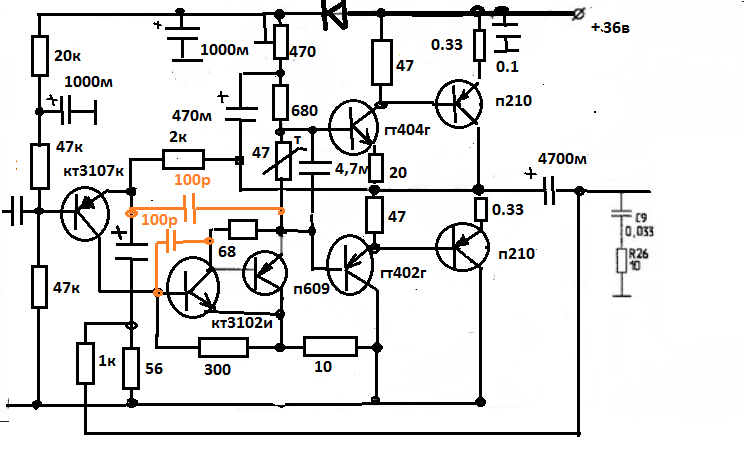 вот такой простой гибрид без оос на п210 с ОК ставим в нч канал,выходники без прокладок на радиаторе,гт701,п210,на выходе можно поставить фнч 5кгц для подавления высших гармоник,а кроссовер на входе с частотой 300...1000гц