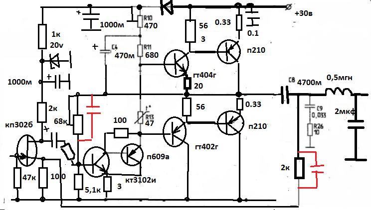 ВЧ звено на низковольтных комплементарных ГТ402/ГТ404, по два в плечо.