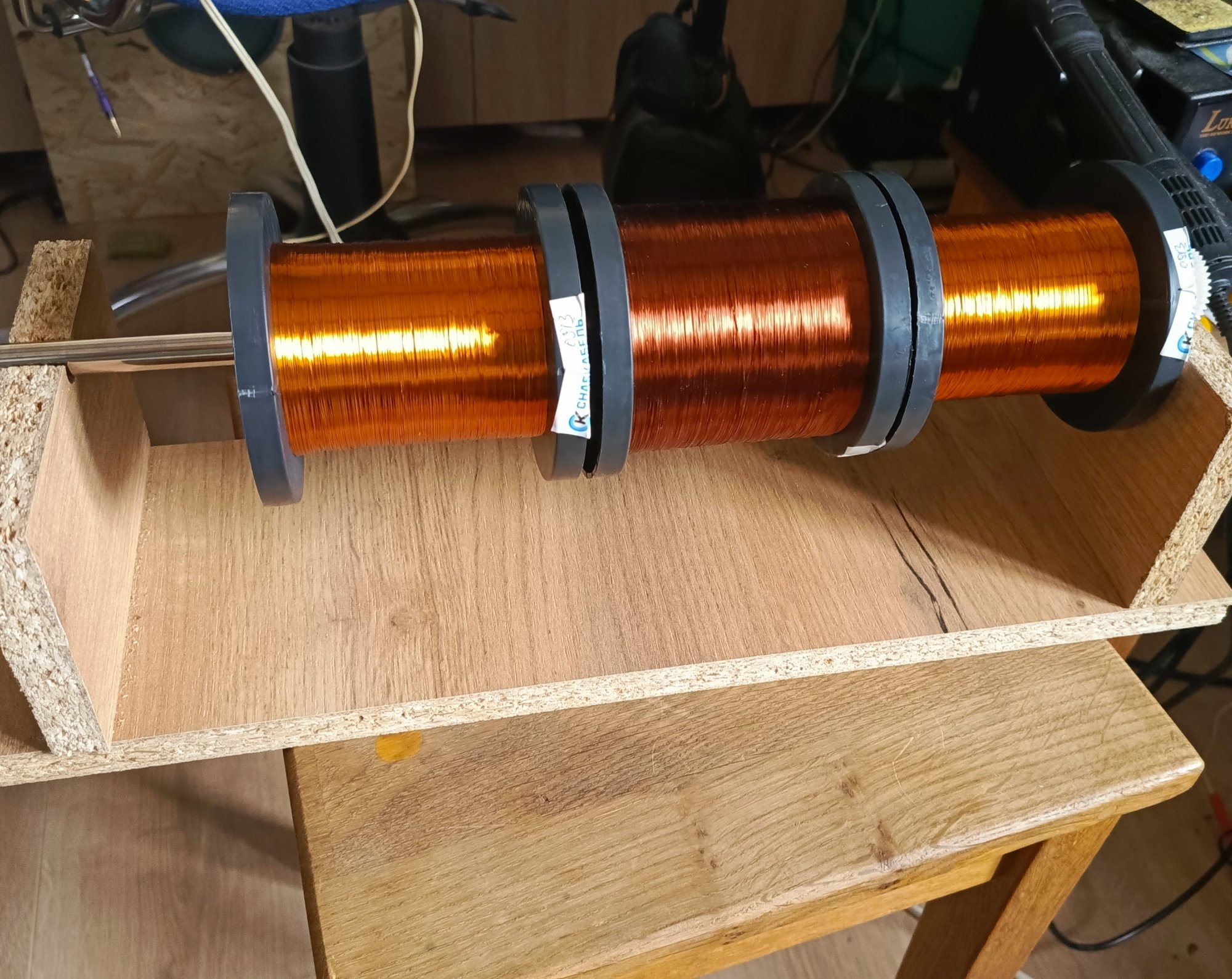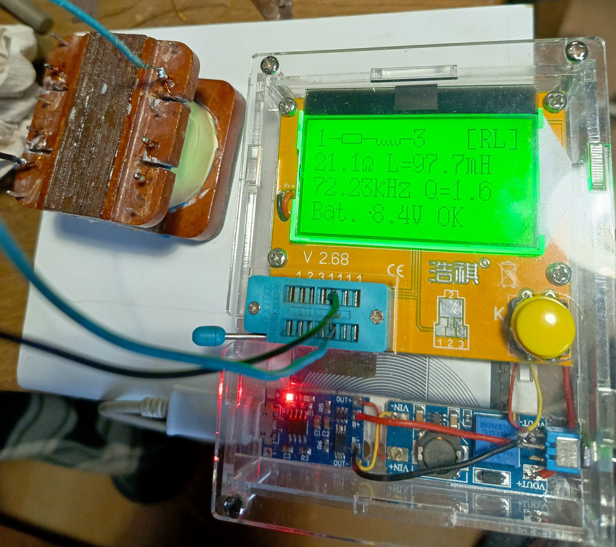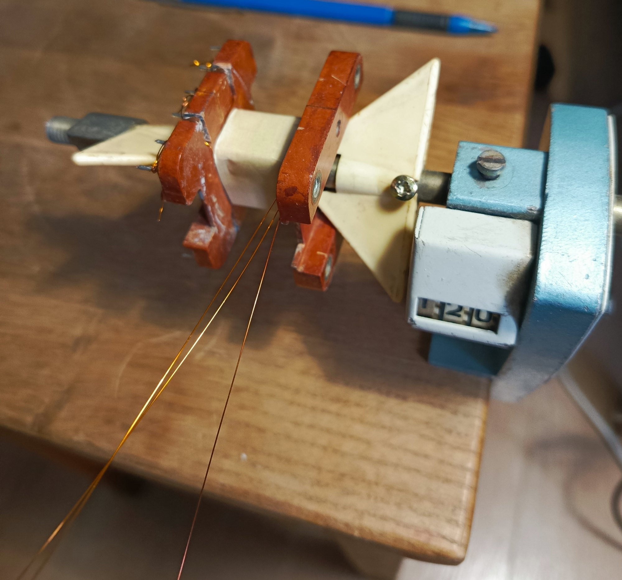 Для намотки трифиляром пришлось купить три катушки провода и сделать для них подставку. Трансформаторы неизвестной породы, от какой-то военки, с зазором около 0.3 мм. Уложить ровно такой тонкий провод, да еще и трифиляром не просто, но вполне возможно. Через каждый слой - разделительная прокладка из тонкой бумаги. Получилось 3х550 витков провода 0.22мм. Параметры на фото, разброс индуктивности по обмоткам в пределах пары десятых.