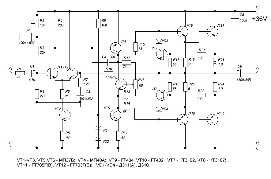 Согласен, что Т4 луше заменить на П609, тогда наверное и Т1,Т3 на КТ3102 с изменением коррекции. Просто ВК на ГТ703\705 мне кажется оптимальный вариант для германия. Может кто то подправит схему, пусть получится не самый крутой усилитель, но зато вполне слушабельный.
