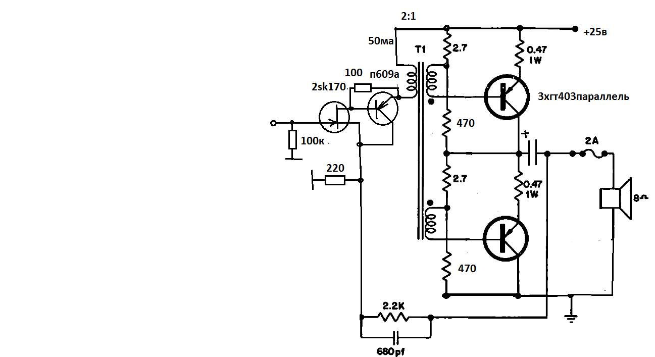 PS .Сорри,трифилляром транс мотаем для схем с ОК,я их выкладывал выше,в данной схеме ОЭ,поэтому транс нужен понижающий,моточные данные можно взять от усилителя Григорьева цитата: