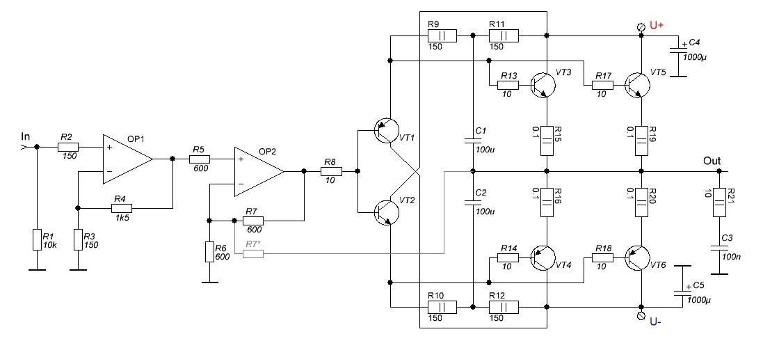 Схема выходного каскада такая пойдёт? Это из даташита 2н2147