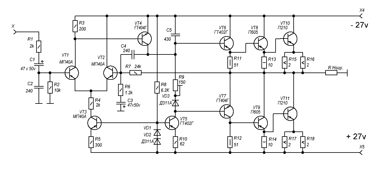 если будете делать без транса на нч транзисторах ставьте в предвыходе гт402\404 и им в эмиттер и коллектор очень малые резисторы 16,,,,22ом,чтобы входные емкости выходников быстрее разряжались,но это повлечет снижение входного сопротивления ВК,поэтому перед ним обязательно ставить каскад с ОК на п605 после УНа в схеме выше так и сделано вд140 ОК перед ВК