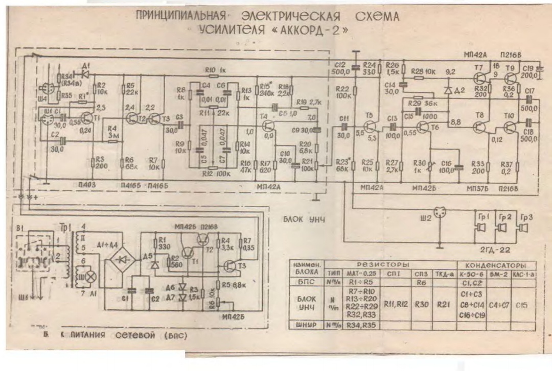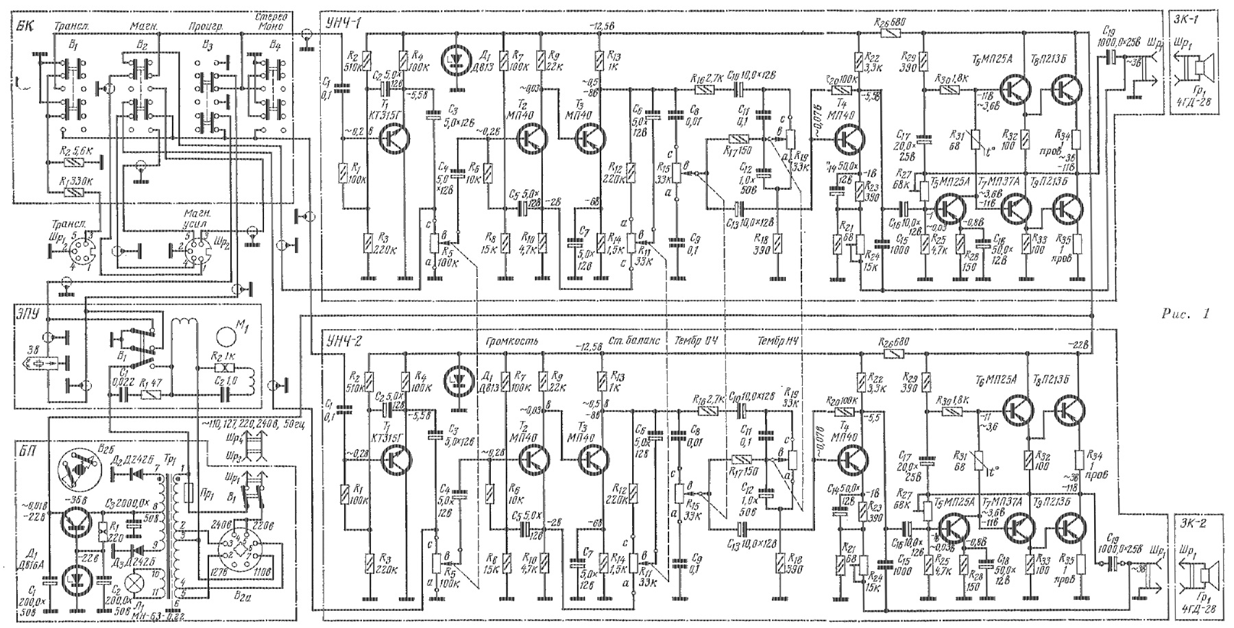 Насчет Лина не спорю, практически все советские схемы тех лет одним Лином мазаны. Но здесь совершеннейшее совпадение именно с канонічнымъ "Аккордом", вплоть до печатной платы и радиаторов. Конкретно - с "Аккорд-201-стерео" (исходный монофонический 1969 года имел другую плату и радиаторы, при той же схеме). Вот, для сравнения. Найдите 10 отличий: