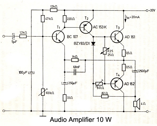 Источник тока в цепи нагрузки драйвера собран на составном транзисторе по схеме Шиклаи, что подразумевает применение в нем транзистора П605 - такого же, как и в драйвере. Цепь вольтдобавки применена в дополнение к источнику тока, т.к. без нее амплитудная характеристика усилителя получается неудовлетворительной. Диод D2 (Д310) в норме постоянно открыт, но защищает транзистор Q10 от возможной переполюсовки на пиках сигнала. Диод D1 (Д310) защищает от возможного попадания обратного напряжения эмиттерный переход транзистора Q10 (например, вследствие каких-либо переходных процессов), т.к. для конверсионных транзисторов П60х максимально допустимое Uбэ обр. составляет всего 0,5 ... 1 В. В нормальном режиме работы усилителя этот диод постоянно заперт и ни на что не влияет.