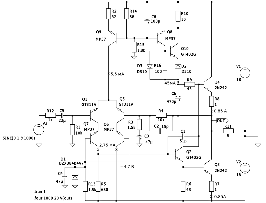 И, сугубо в порядке данного рода занятий, прикидываю моделировавшийся ранее усилитель в его "максимальной" конфигурации, а именно с каскодным дифкаскадом и источниками тока. Помимо всего прочего, я дополнил LTspice ранее отсутствовашими моделями советских германиевых транзисторов, которые любезно предоставил мне Никитич.