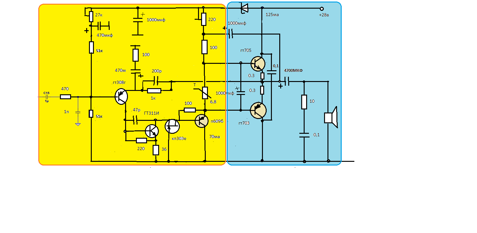 там пищалка в нагрузке,поэтому транс небольшой,4см кв,кпд в теории класса А с трансом под 50% причем мощность не большая 3вт с головой для той же 2гд36 например
