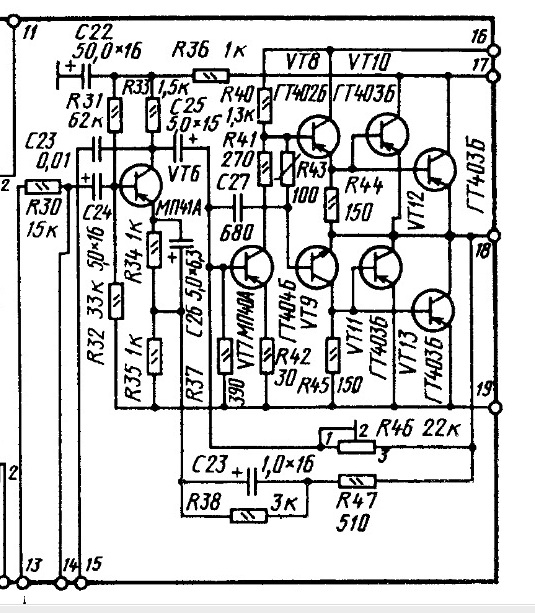 т6,т7 заменить на кт3107 К,Л,резистор R42 закоротить