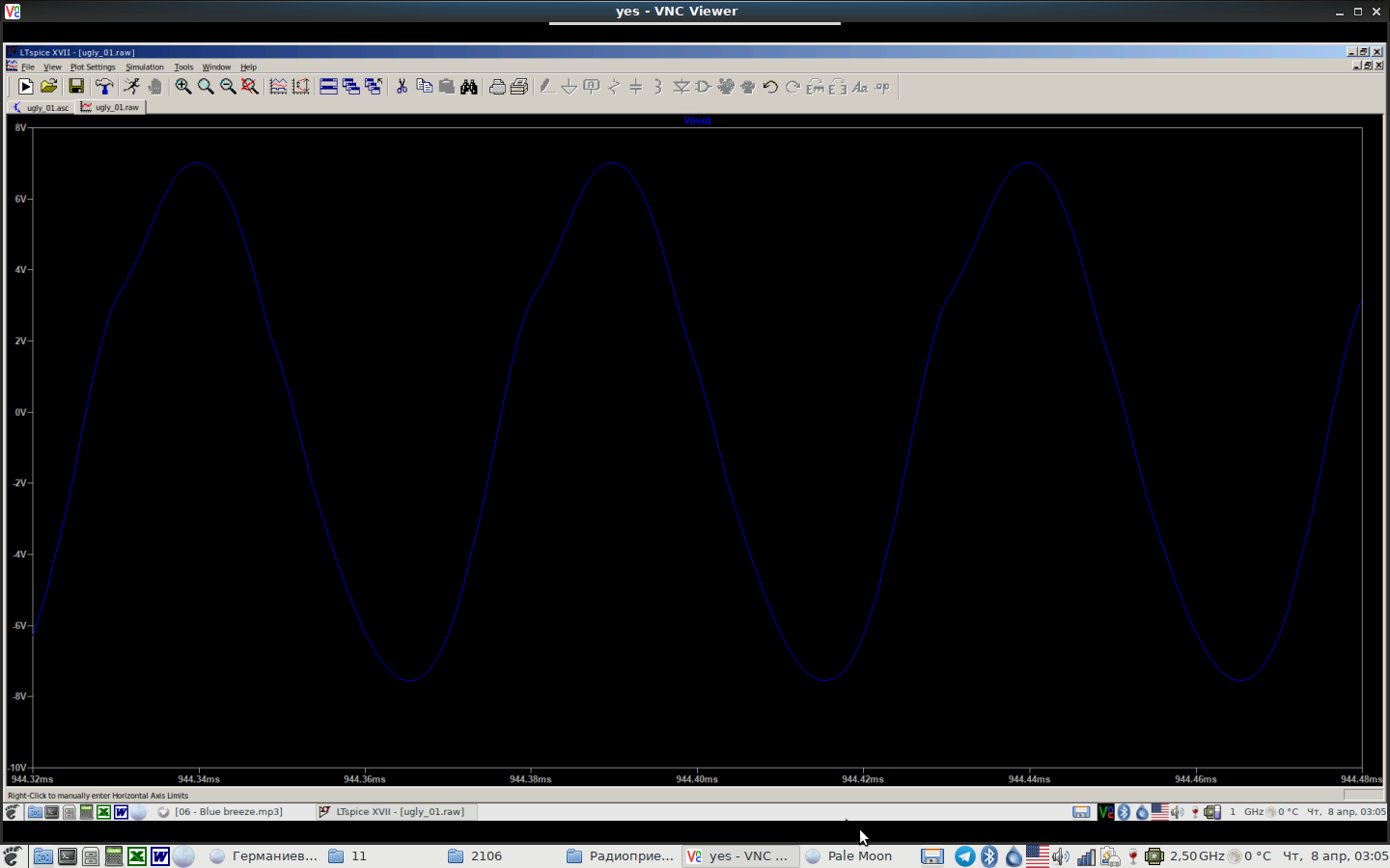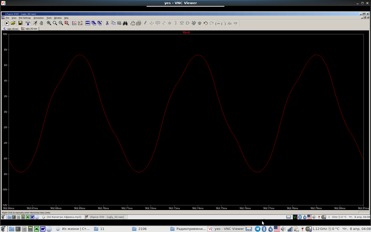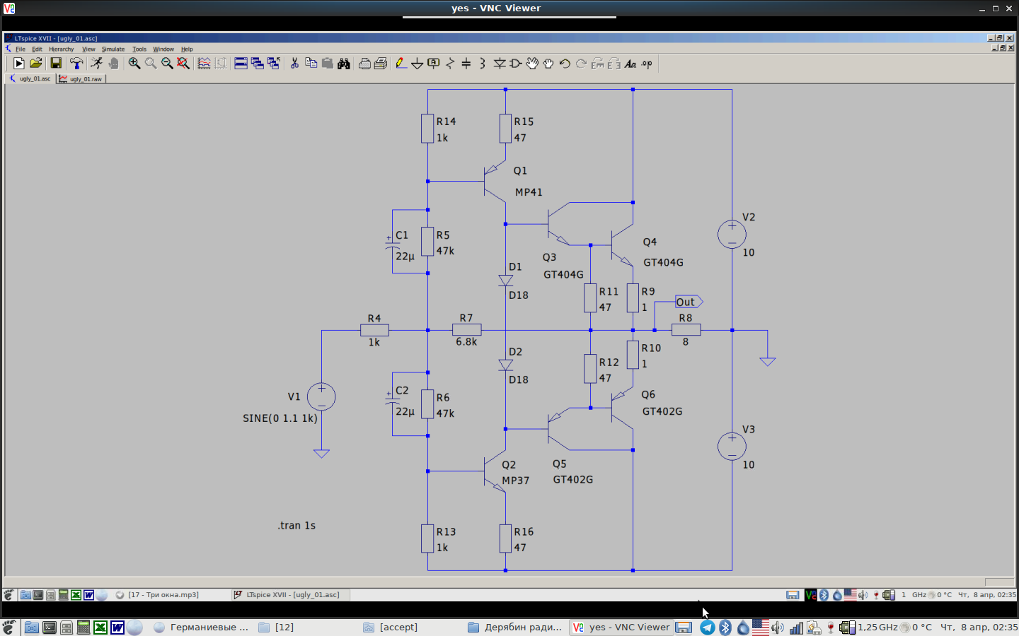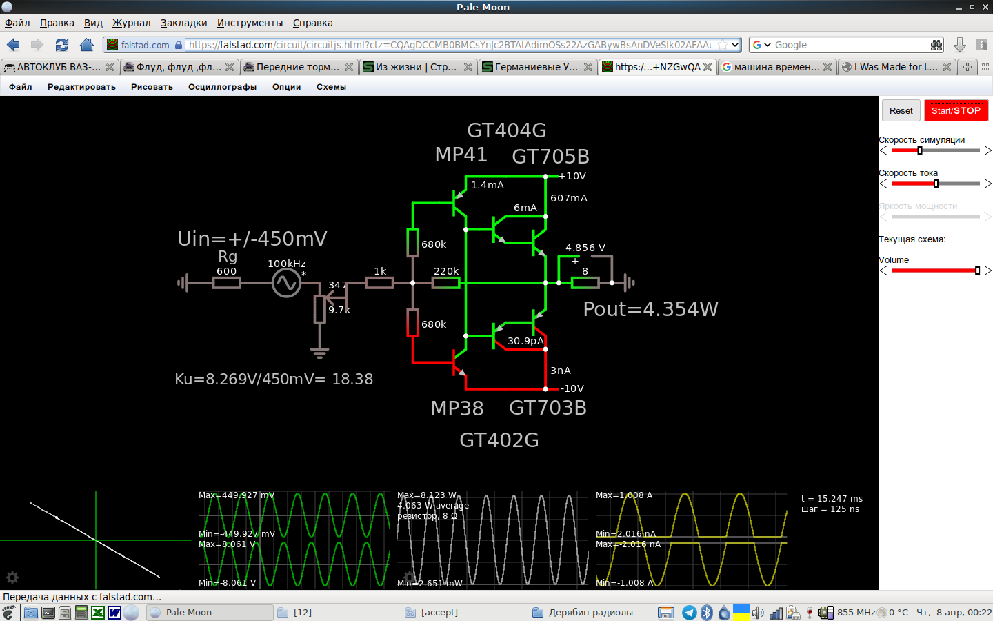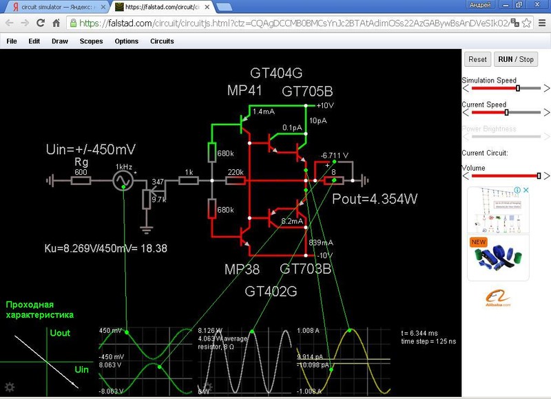 Как результат, при амплитуде на входе 0,45 В получил на 8-омной нагрузке амплитуду 0,6 В (вместо 4,9 В в онлайн супер-пупер симуляторе), и притом с дикой ступенькой: