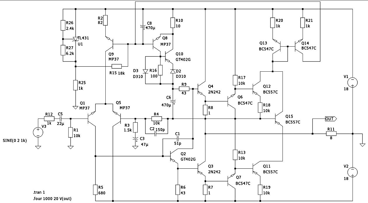 Далее этот ток отражается с коэффициентом, равным 1, транзистором Q14, и вычитается из тока, заданного ИОН на U1 с напряжением около 9 В относительно источника питания -18 В и резистором R15, уменьшая тем самым токи ИТ на транзисторах Q9 и Q8, Q10 и как следствие - уменьшая ток покоя выходного каскада. Остаточные пульсации отфильтровываются конденсатором C8.