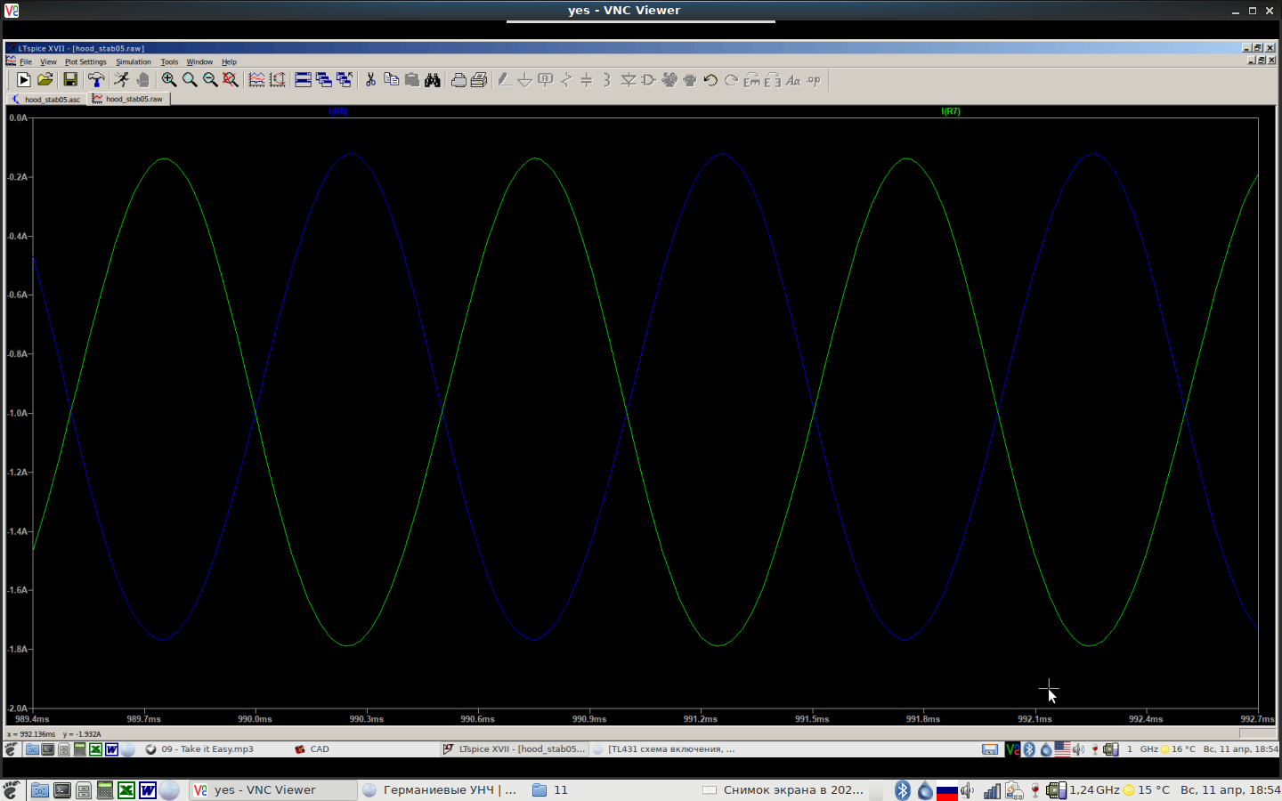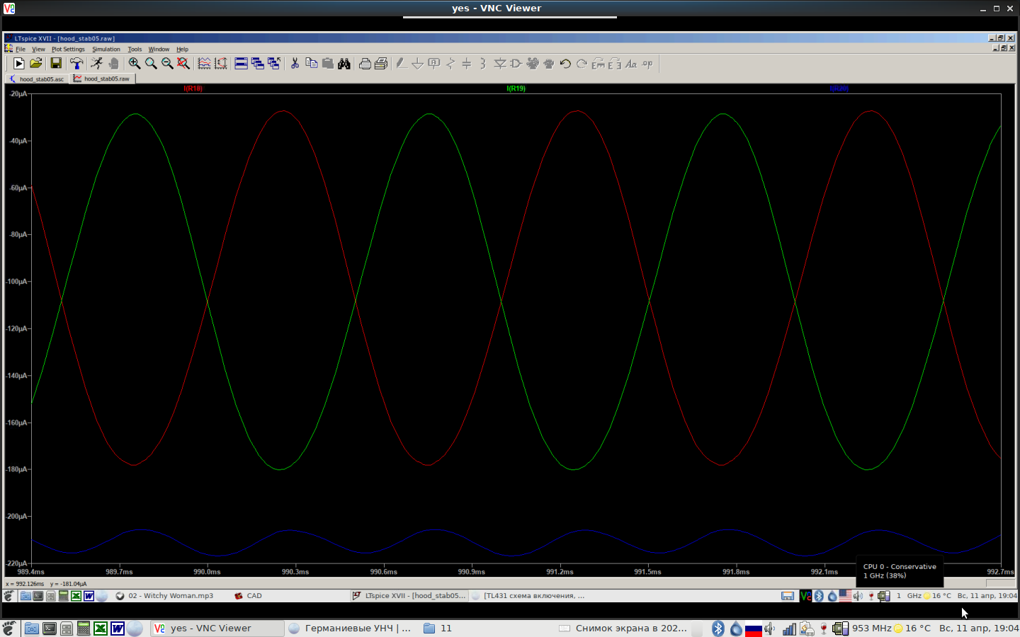 Зеленая и красная осциллограмма - это токи ИТ Q11 и Q12, а синяя - ток через транзистор Q13 (на входе токового зеркала).
