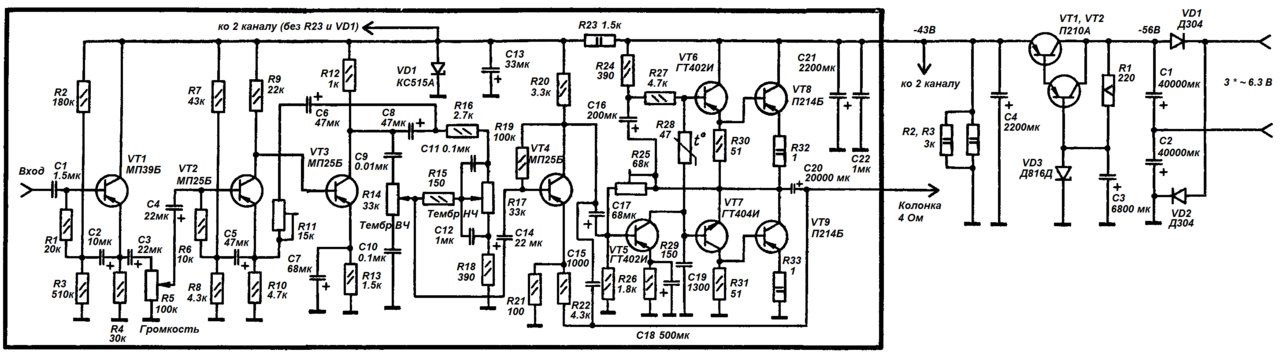 Экземпляр Д816Д тут не 43 В, а чуть выше, где-то 45.6. Работает с 2018 до сих пор, но на самом деле много неоптимального получилось. Не нужны резисторы R3-R4 в блоке питания, если есть R2, только впустую греются. В основной схеме первый каскад не совсем правильно рассчитал, хотя и так работает - R3 лучше 180к, а не 510. VT2 лучше МП39Б, очень уж микротоковый режим для МП25. По некоторым электролитам явный перебор даже с учётом частоты среза 2 Гц - C1 хватит и 1 мкФ, C3 - 1.5 мк, C4 - 4.7 мк. Но самое главное - для нагрузки 4 Ом ток КУН (VT5) в 4.5 мА всё равно маловат, да и ток покоя выходников занижен, всего 3 мА получилось. Наверно, отсюда и искажения овер 1%, хотя на слух всё нормально