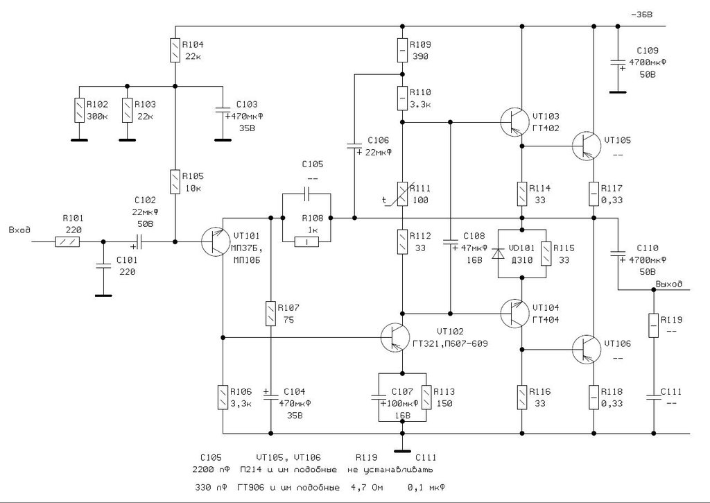 Схема Зыкова в режиме АВ , на 4 Ома вполне рассчитана, на выходе МП21 или 26, МП 37 или лучше мп10, военка. А 402 и 404 с большим усилением и вольтажом- на букву ВЖГИ , 905-е или 806-е ставим вместо 605-х.