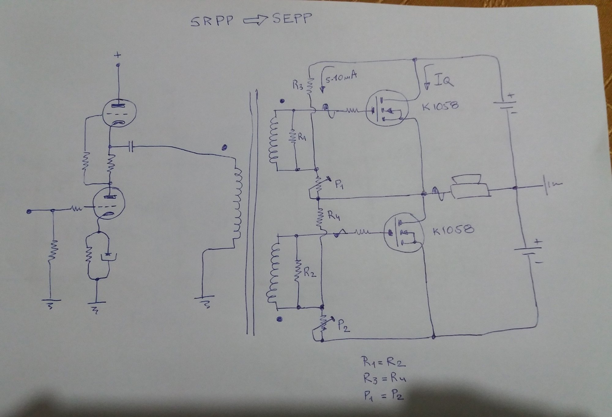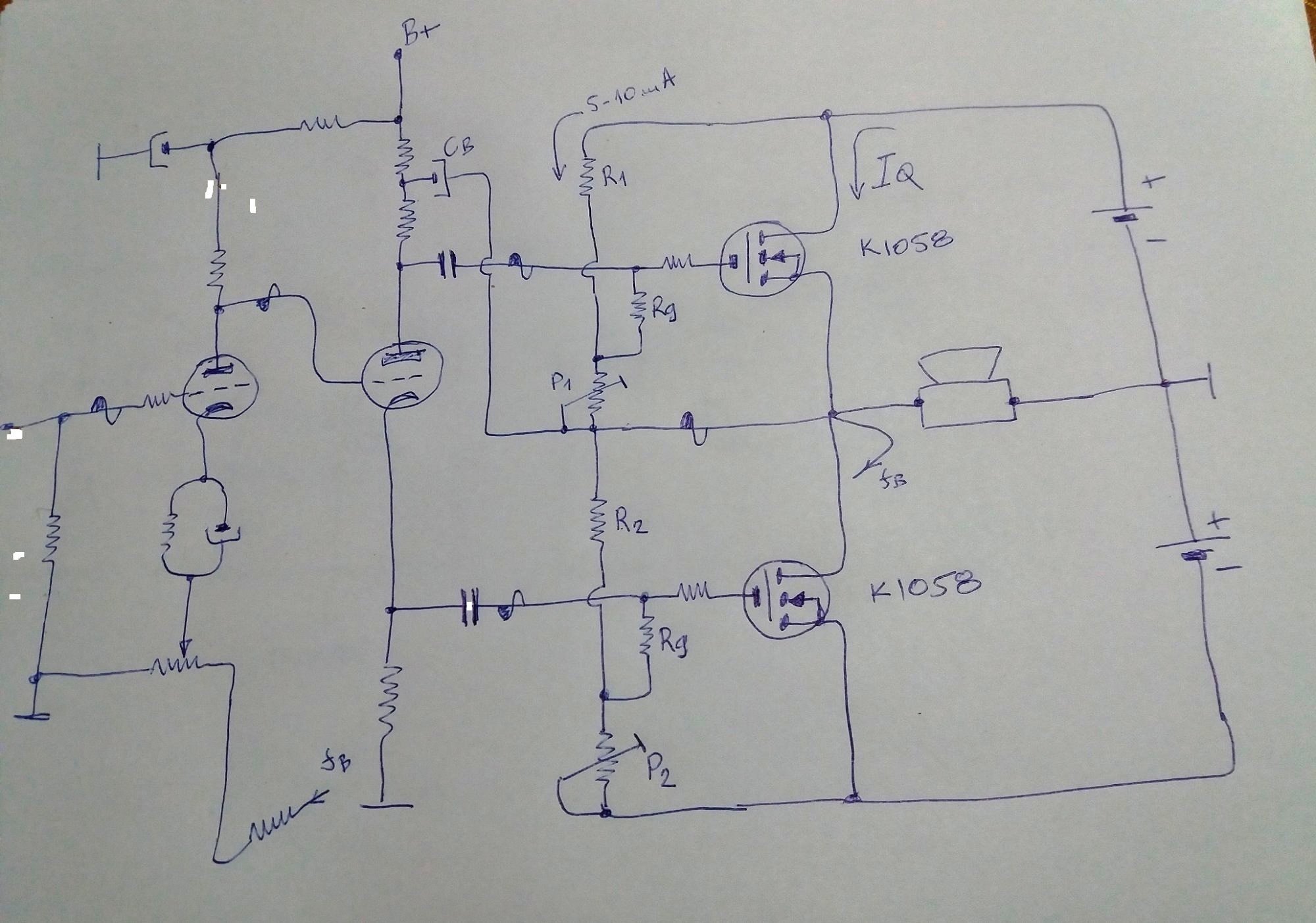 таким образом, верхний транзистор настроен на работу почти как любой «истоковый повторитель», в то время как нижний транзистор работает как «стоковой повторитель» с сильной локальной отрицательной реакцией переменного тока, полученной от резистивного делителя R4 и P2, таким образом передаточная динамическая характеристика нижнего транзистора линеаризуется и близка к характеристике триодов, чем пентодов, но коэффициент усиления по напряжению также снижен