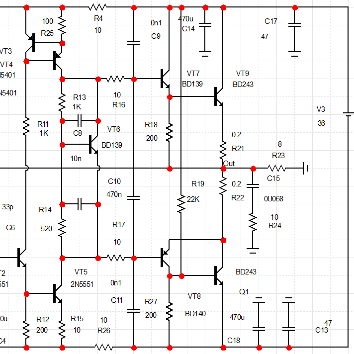 V6 кт3107, r48 r49 увеличить раз в 20, ток покоя выставить ~40 ма r57.