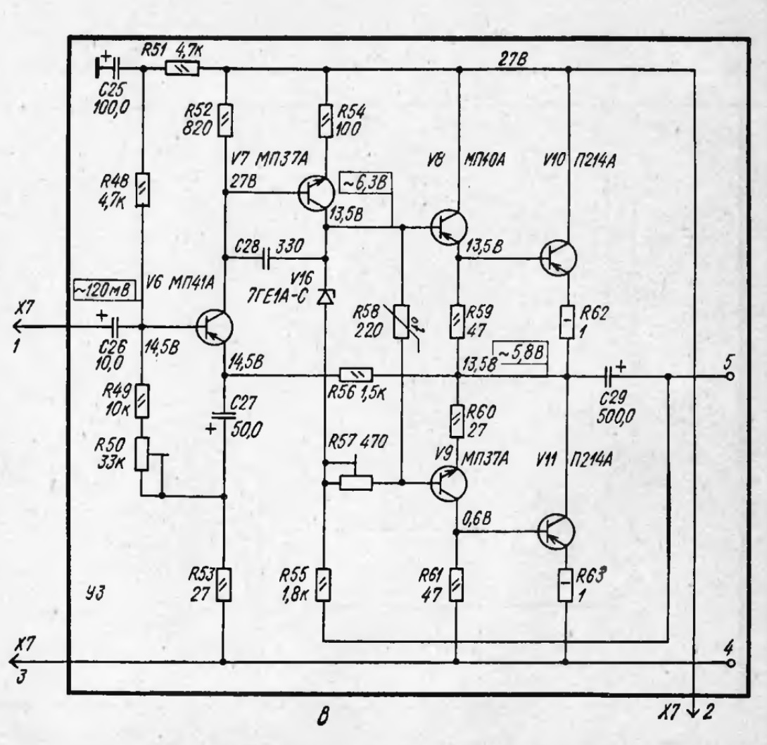 Из описания: 1 тиристор, 27 кремниевых транзисторов, 4 мощных кремниевых транзистора, 7 кремниевых диодов...