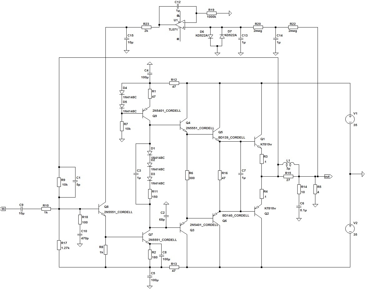 На счёт оконечника, классический параллельник Агеева имеет главный недостаток в том, что выходная мощность ограничена током предвыхода. Так как предвыход в параллельном усилителе не открывает, а наоборот запирает выходные транзисторы ( достоинство решения- ниже коммутационные искажения). При открытие же выходных транзисторов ток берется из резисторов между базой и питанием. Соответственно с ростом тока базы выходников растет и падение напряжения на этих резисторах- в результате значительная нехватка мощности. Есть несколько вариантов решения проблемы: