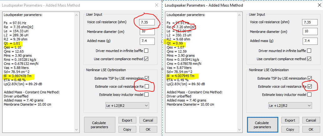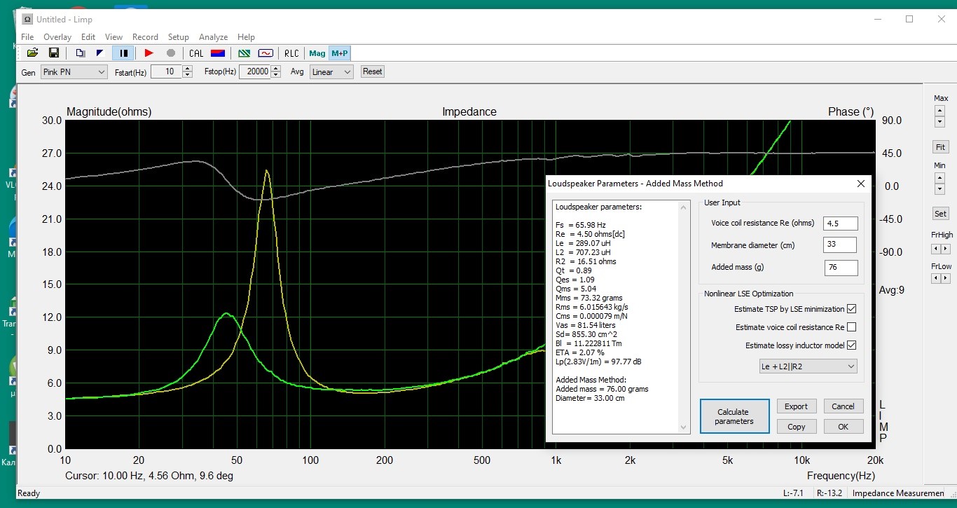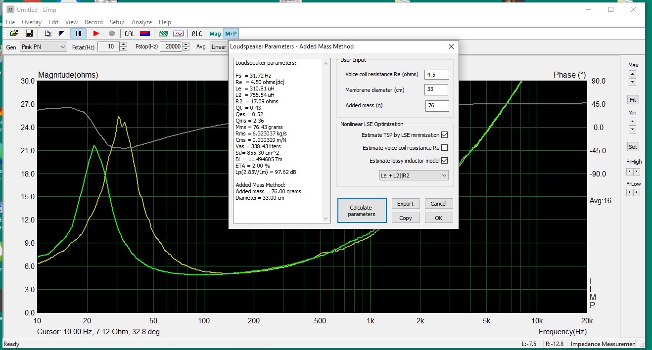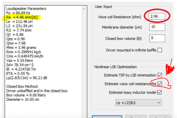 Если доверяю ЛИМПу определить Re и ставлю галочки в указанных окошках, то расчётное значение ( выделенное жёлтым) получается много меньше, чем измеренное. Например измеренное 3,5 Ом, а ЛИМП рассчитывает при включении этих окошек 2,4 Ом и соответственно электрическая и полная добротности рассчитываются также заниженные. Поэтому приходится вводить измеренное тестером Re или минимальное значение импеданса из графика в правое верхнее окошко. Кто знает в чём дело ?