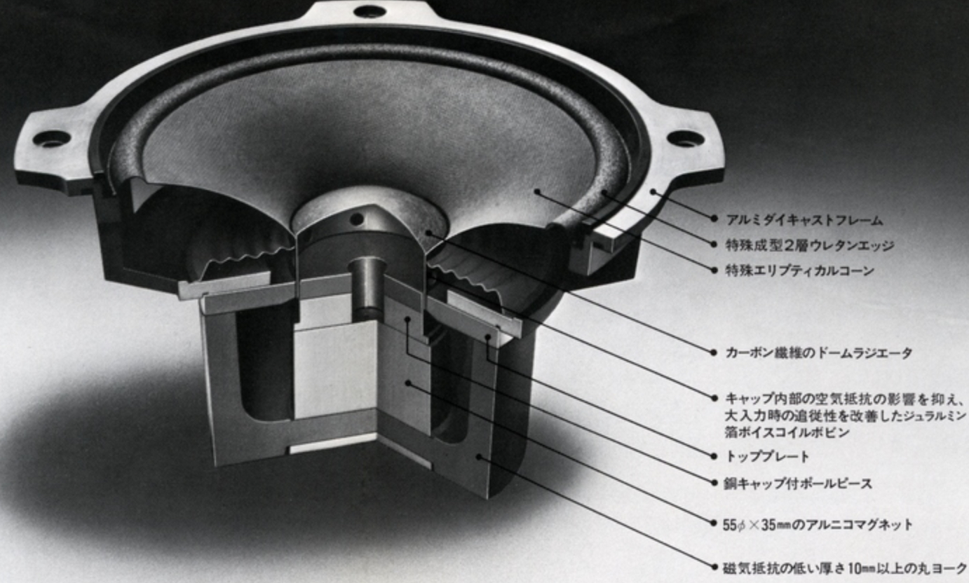 Конус представляет собой сэндвич, изготовленный из слоистого запатентованного композита. Полюсный наконечник покрыт медным кольцом для противодействия индукции звуковой катушки для увеличения высокочастотного выхода. Один LE8T-H может создавать уровень звукового давления более 93 дБ на расстоянии 3 м не только на частоте 500 Гц, но и на частоте 50 или 5000 Гц. Его частотная характеристика и прозрачность не могут быть достигнуты ни одним другим отдельным громкоговорителем.
