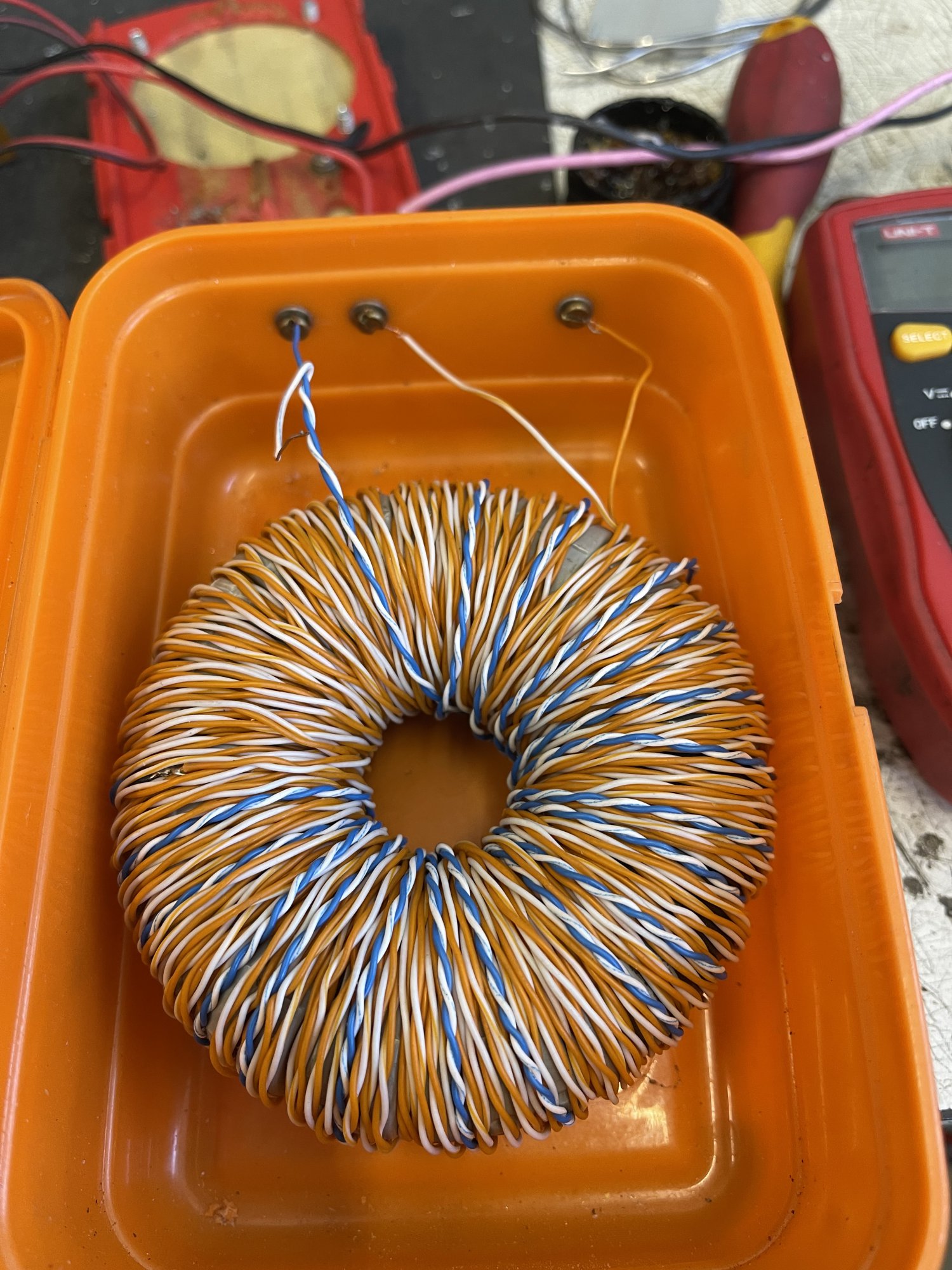 Катушка тора намотана витой парой на усиленном каркасе от кассеты видеомагнитофона.