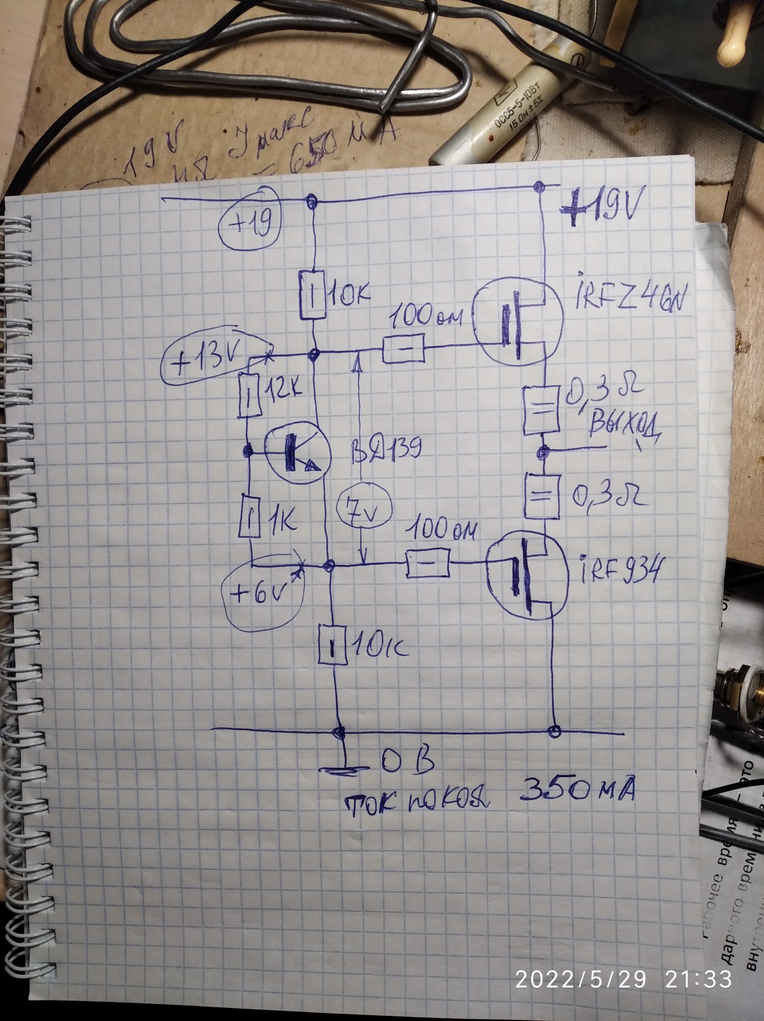 Сегодня смакетил выходной каскад на паре комплементарных полевика вертикалов от ИРФ, 934 и 46. С питанием от 24 вольт и током покоя 350-700 ма они бегут до 1МГц бегом.ток покоя очень вяло растет,уже вырулил термодатчик на BD139,пашет.