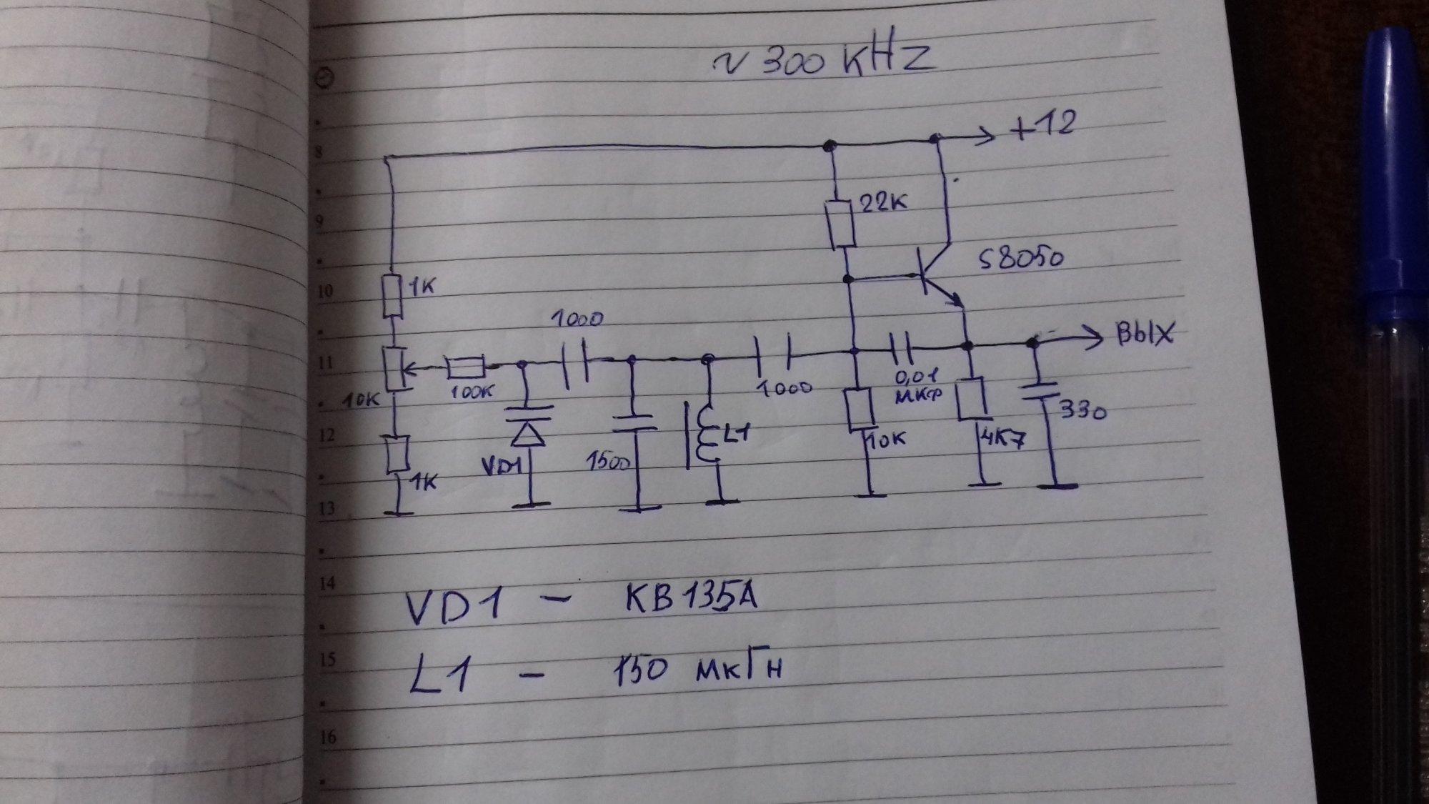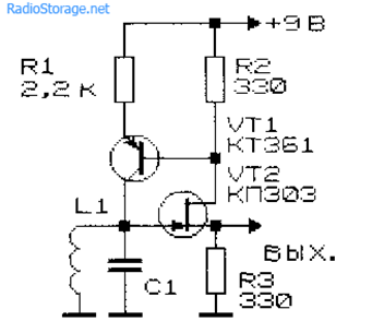Для получения выходной частоты 300 кГц нужна индуктивность катушки контура около 240 мкГ (22 витка провода ПЭЛ диаметром 0,2 мм на ферритовое кольцо К10х6х4, или что-то подобное).