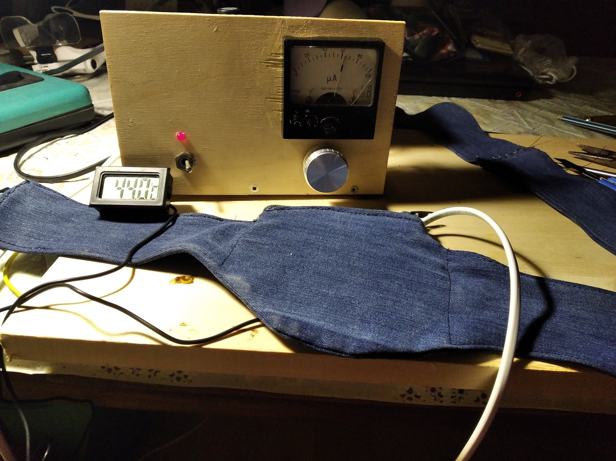 Мой вариант чудо прибора. Сделал по образу и подобию А.Б. микроамперметр показывает ток потребления в момент резонанса, катушка вшита в пояс от старых джинсов.