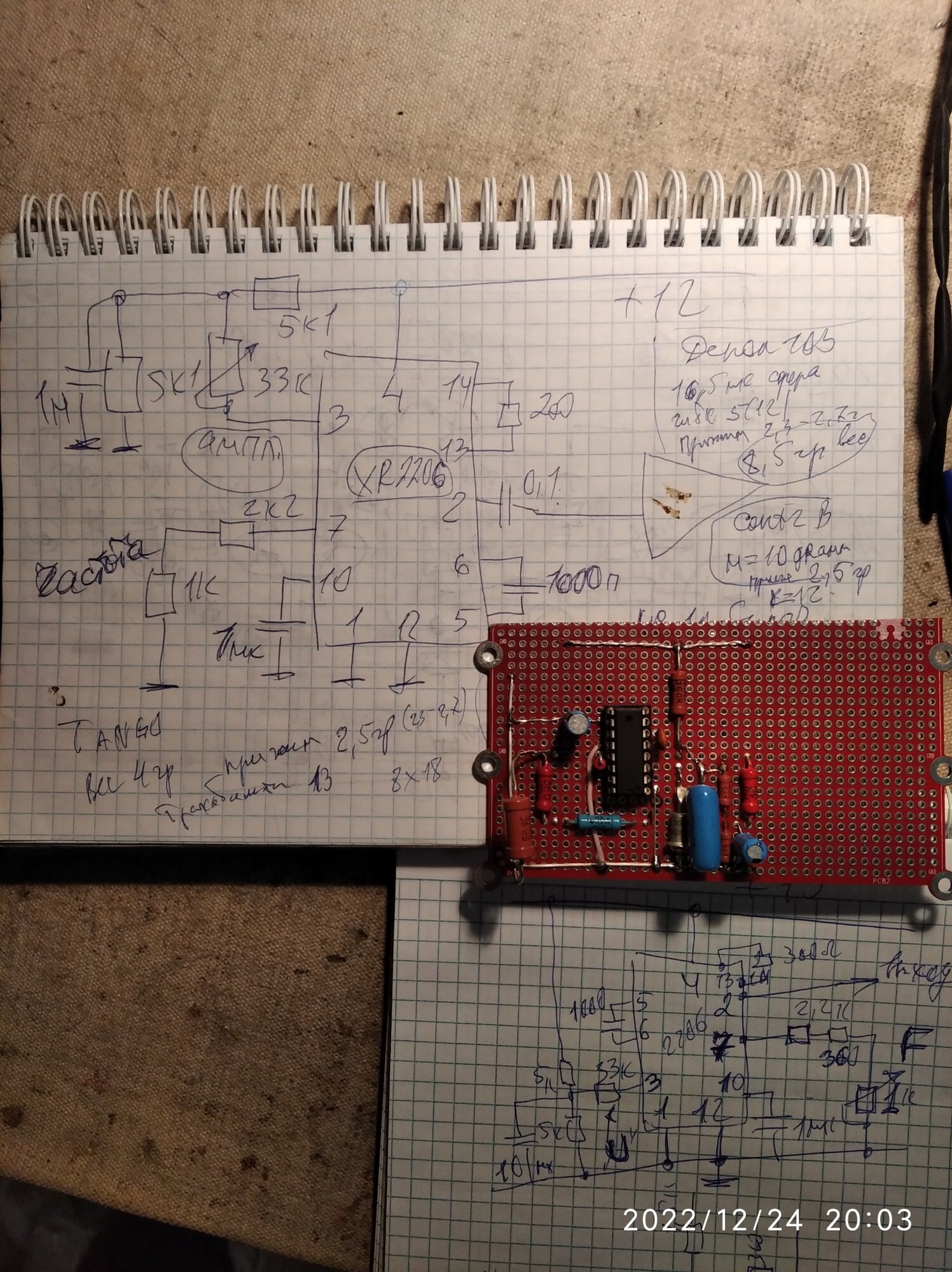 Сейчас смакетил генератор на XR2206 , уточнил обвеску, подписал необозначенные выводы на прежней схеме. Все работает сразу , питание от 15 до 30 вольт выдает синус 3 в на пике. 2 в эффективного , период 3,3 мкс. Это 300 килогерц .Завтра продолжу, будет новый выходной каскад, с малым током покоя, термостабильный. Раскачку видимо сделаю на 544уд2, проще и привычнее, чем транзисторная схема.