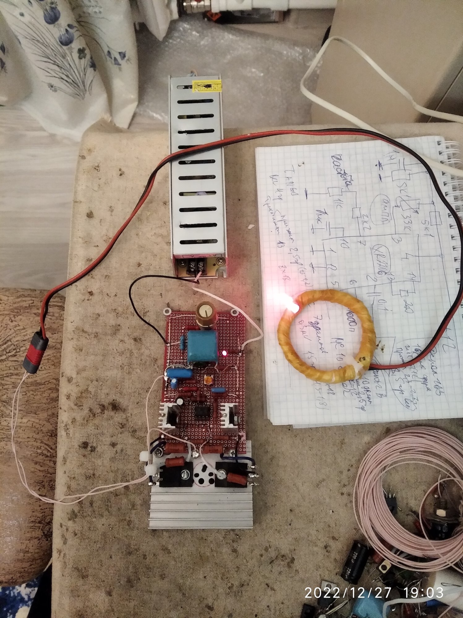 Генератор Сашина с катушкой Пашина.В катушке индикатор тока резонанса.Светится зеленым на пике резонанса. Питание 24 вольта. ток 0,4 ампера, ток покоя 100ма.