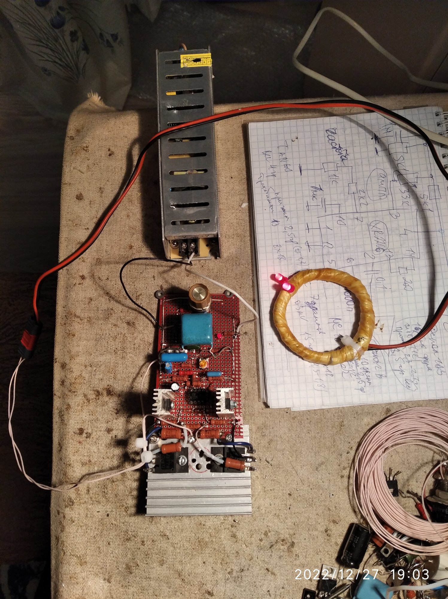 Поставил 100 ом, выходнре эффективное на резисторе нагрузки уехало к 12 вольт чистого синуса. Катуха холодная, резонанс понизился до 301 кгц, если накрыть рукой, едет к 296 кгц.