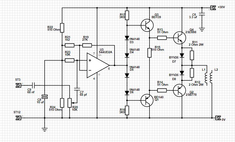 В моём аппарате (схема Бокарёва, за что ещё раз спасибо), однополярное питание 34 В, это соответствует +-17 В. Почему так? КР544УД2 - НЕ rail-to-rail и сигнал частотой 300 кГц на нагрузке поменьше питания (не забываем, что выходной мощный усилитель-повторитель имеет коэфф. передачи менее 1 т. е. ослабляет напряжение).