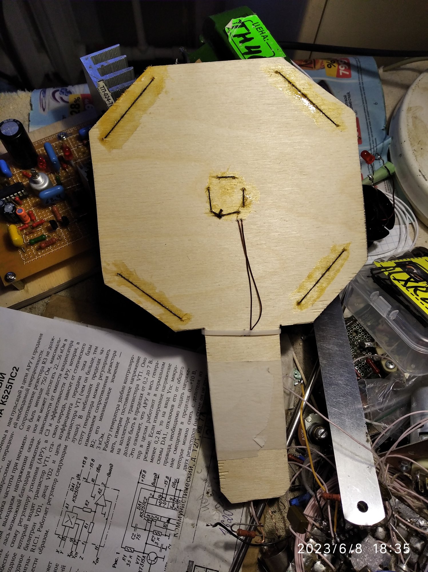 Детали вдогонку. Новая плоская катушка . намотанная проводом 0,5, создала мощное поле, сильный нагрев в центре, поэтому можно спокойно убавить ток до нормы и быть уверенным в эффекте. Заодно выяснил, что индикатор поля нагнулся, диод перестал светиться, обрыв. И что неприятно, перестал он работать постепенно, а я все грешил на неважную тороидальную катушку. Хотя, она по эффективности все равно слабее плоской. Новый диод рядом с катухой меняет цвет на желтый, явно перегрузка по току. Нужен ограничитель, иначе диоды быстро наворачиваются.