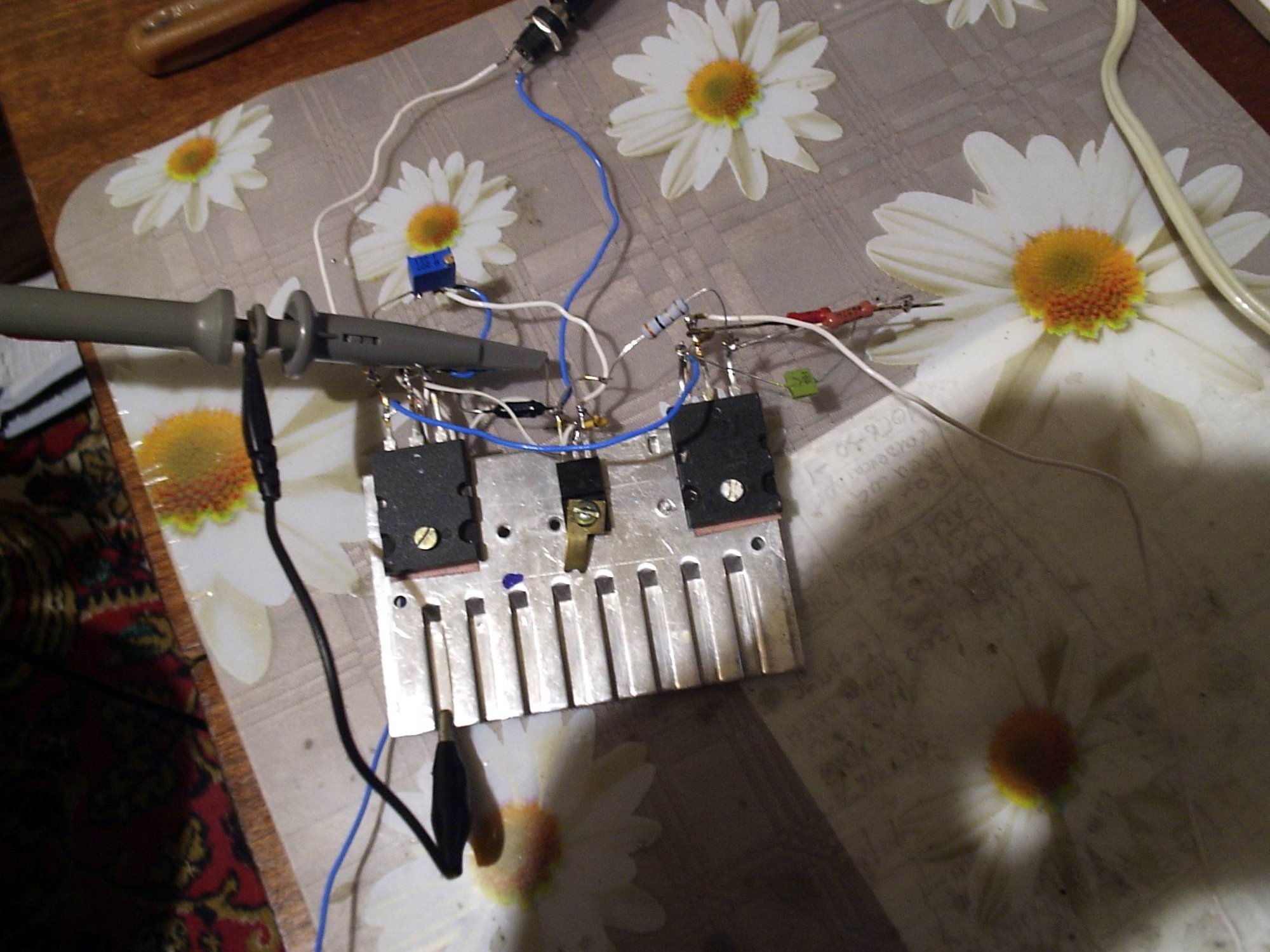 Дешевле и сердитее чем 3 транзистора типа КТ805 найти трудно (их у меня нет, взял те что уже были прикручены к радиатору). Кстати, годятся и КТ903. Всё хорошо, только синус желательно почистить. Сегодня лень возиться.