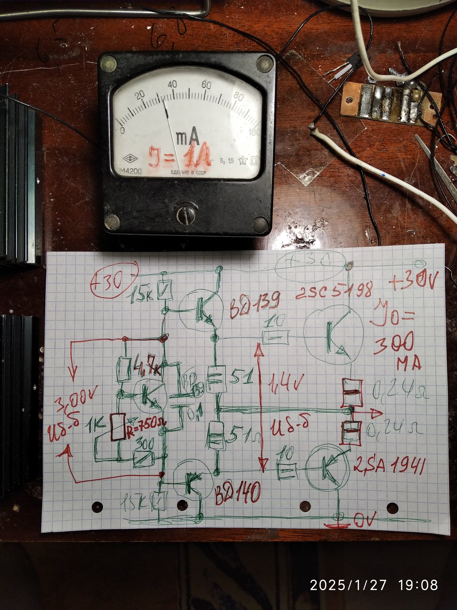Потренируюсь на кошках, одном этаже из транзистора, смещения 240 Ом 2 вт, диода+резистора в базе и амперметра с питанием 15 вольт.