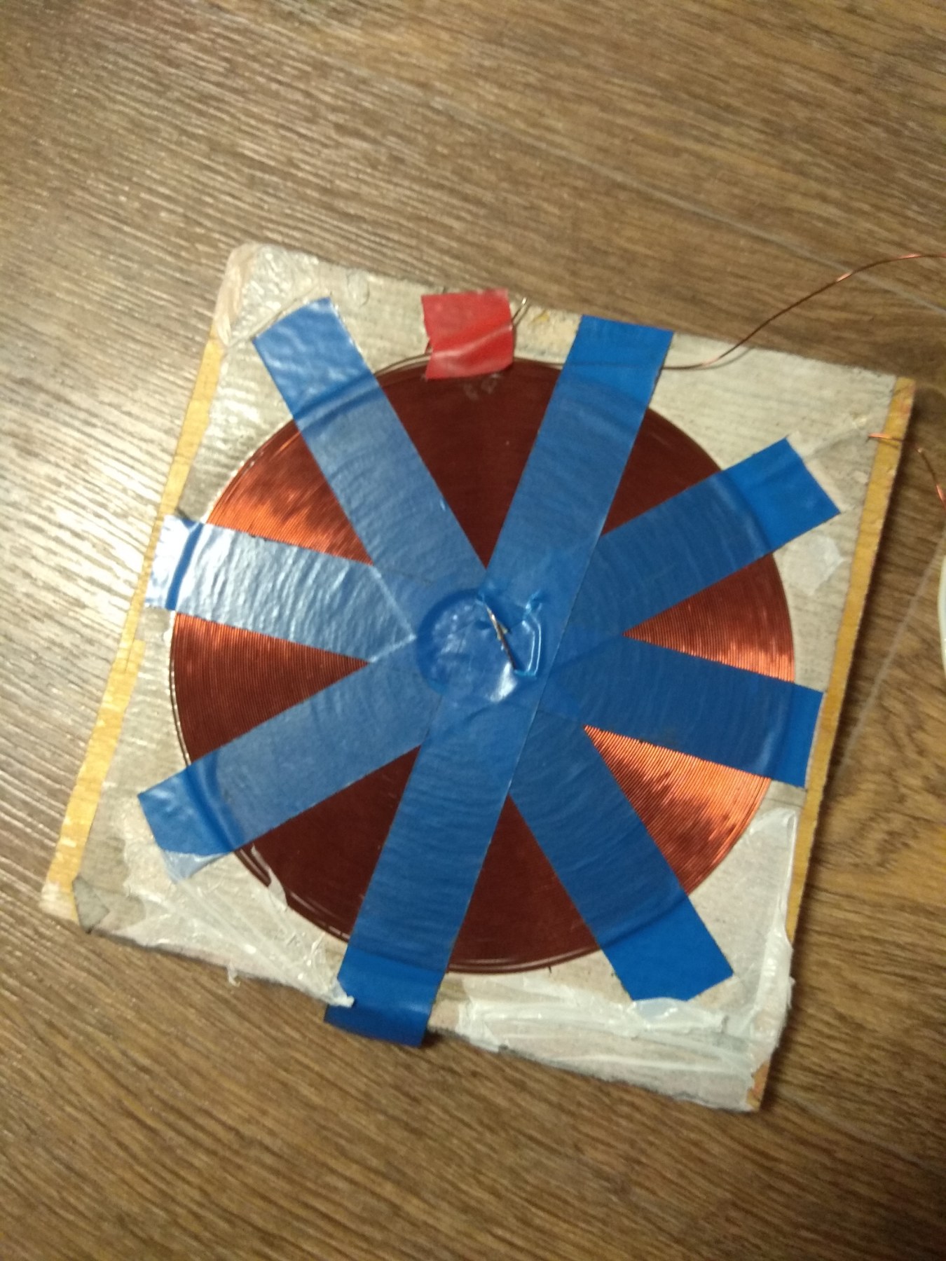 Вопрос 2. "Плоская катушка". Насколько я понимаю, намотка ведётся в 2 провода. Напряжение подаётся одним проводом к началу первой катушки и к концу второй катушки, вот так.