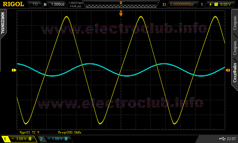 На темном рисунке показана осциллограмма воспроизведения микросхемой TDA7293 синусоиды частотой 200 кГц и амплитудой примерно 10 вольт (голубая линия – инвертированное входное напряжение, жёлтая – выходное напряжение).