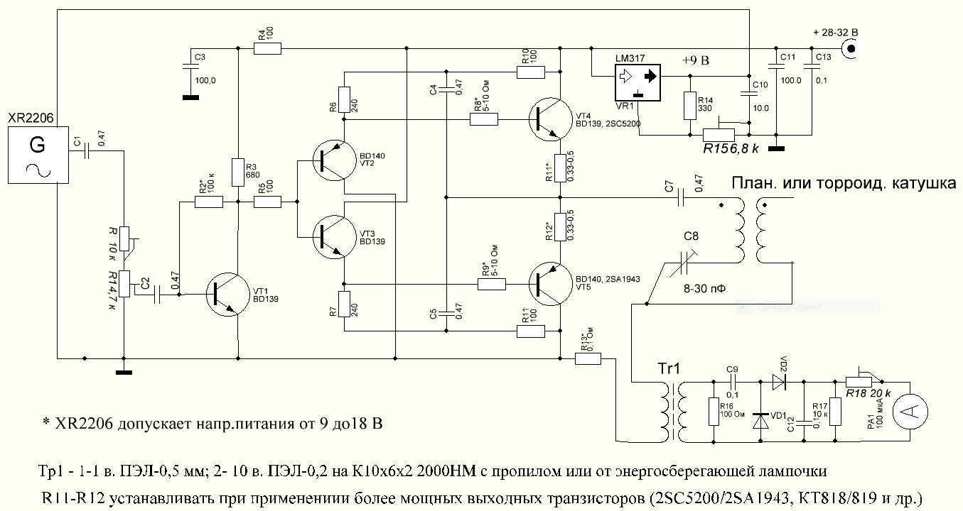 У меня при штатном китайском питании от XR2206 получается 2 В (6 В пик-пик), думаю, использовать на 1 В, далее транзисторный усилитель на 2-х транзисторах с усилением около 10, далее - повторитель Агеева. катушки пока нет.