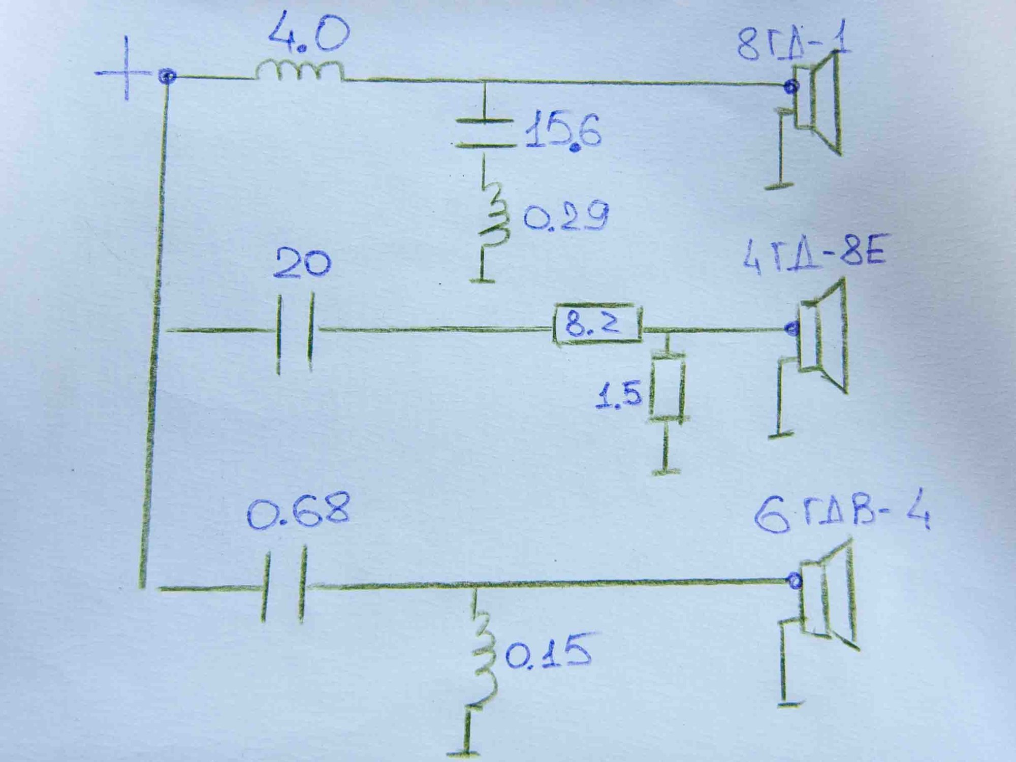 Серия динамиков которые стояли в этой трехполоске:30ГД-2, 75ГДН-1Л4. При поджимании правой стороны, выпячиваются частоты 200-500гц. и чем больше ёмкостей добавляется ,тем больше гула .Ранее и была применена схема с двумя катушками в линию,между ними кондеры на минус ,что уменьшало гудение.