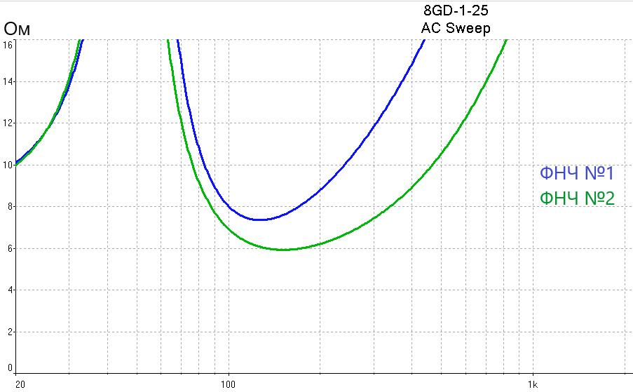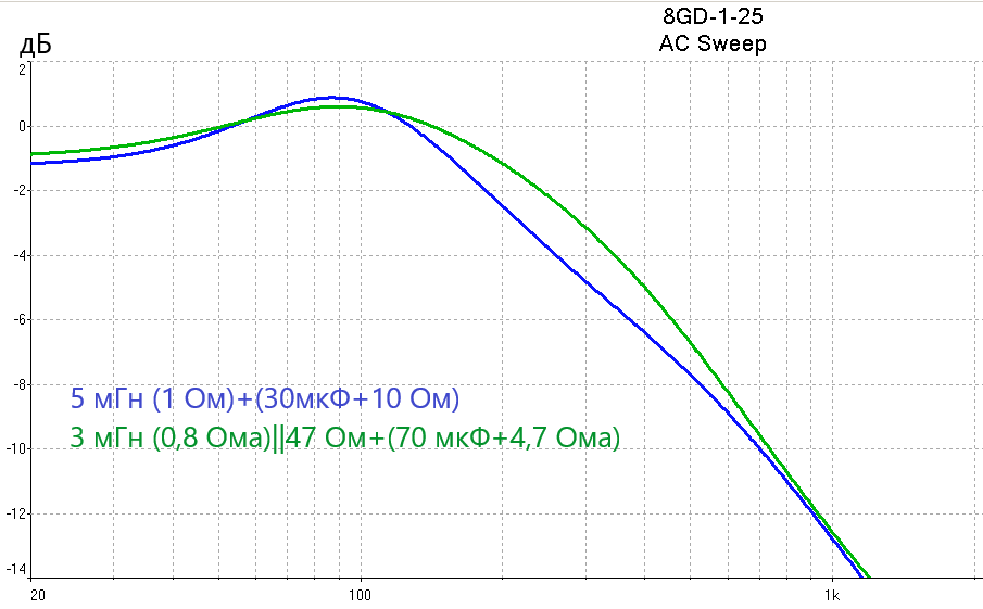 Немного считалочек. ФНЧ в составе 5 мГн (активное 1 Ом) плюс цепочка 30мкФ+10 Ом в параллель динамику (синие кривые) против ФНЧ в составе 3 мГн (активное 0,8 Ома), в параллель этой катушке поставлен резистор 47 Ом, плюс цепочка 70 мкФ+4,7 Ома в параллель динамику (зелёные кривые). Схема замещения для 8ГД-1-25 #144 .