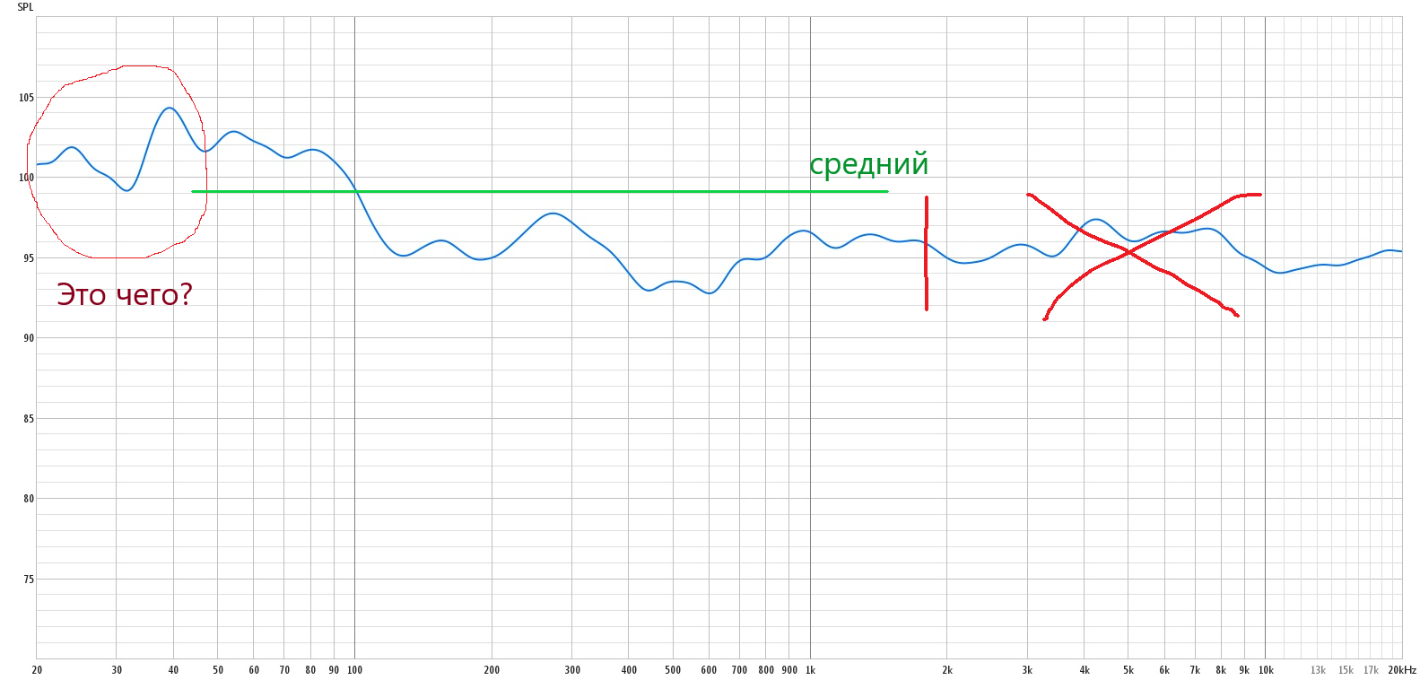 Ну как то это всё странно выглядит, область 100+ Гц торчит над участком 1кГц на +5дБ, и при этом всём, еще на -3.5дБ задавлена ВЧ