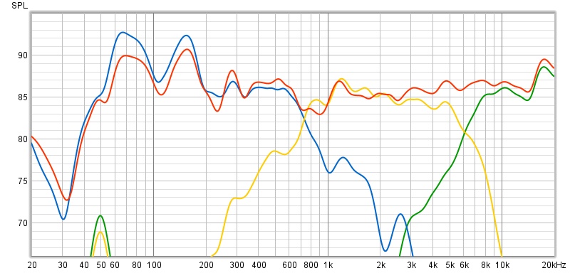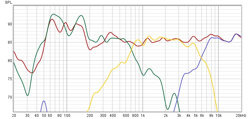 Откуда-то сверху пришли неожиданные решения ,которые подправили расстановку сил в трехполоске.Снится сон ,заходит на прослушивание сосед ,живет через дом и говорит :"Что то нарушено с фазировкой."До этого смотрел ролики про фазирование динамиков.Утром перекручиваю информацию и вспоминаю,что в s90 нч динамик по схеме подключается +на-.Вечером перетыкаю и замер показывает ,что на высоте общего замера сч-вч линий практически не меняются диаграммы для 8гд1 .А с полярностью +на + происходил подьем или возбуждение на частотах 200-500 гц.Получились следующие линии.