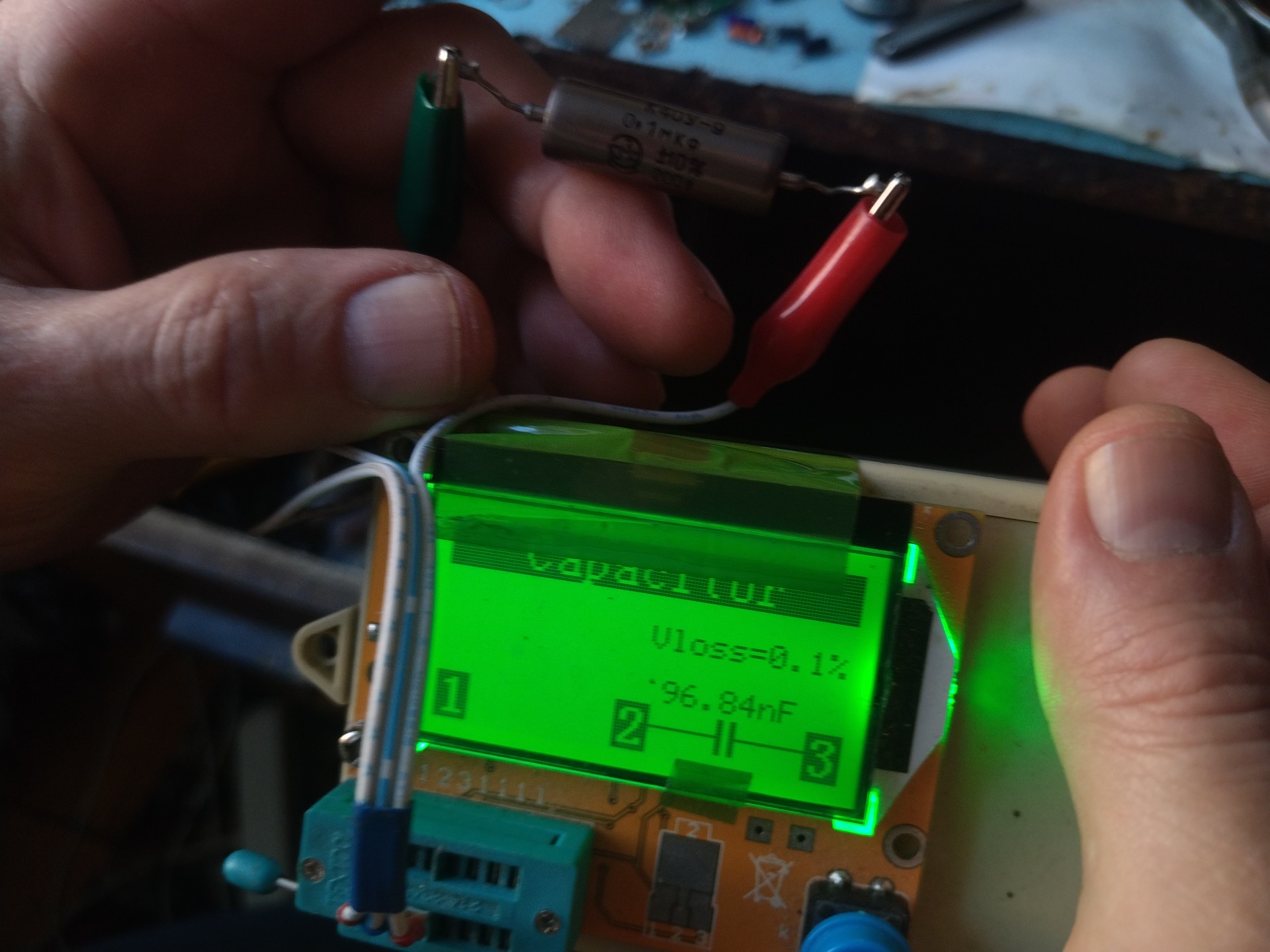 Есть два коденсатора слева ТСС древние, L-метр показывает 0,6-0,7 мкф, пробником видно, неонка даже не гаснет(!), утечка охеренная, показываю для примера и не задавали вопросов, а почему не работает