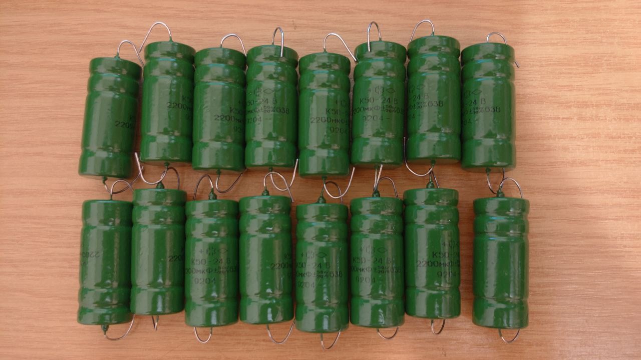 Прикупил не дорого к50 24 2200мкф 63в. Не использованые, были в заводских коробках, военная приёмка. Разброс по ёмкости от 2000 до 2450мкф. Утечка от 0.9 до 1.6%. ESR на коротких проводах от 0.02 до 0.04ом. Очень хорошо покрашены толстым слоем краски. Очень доволен покупкой!