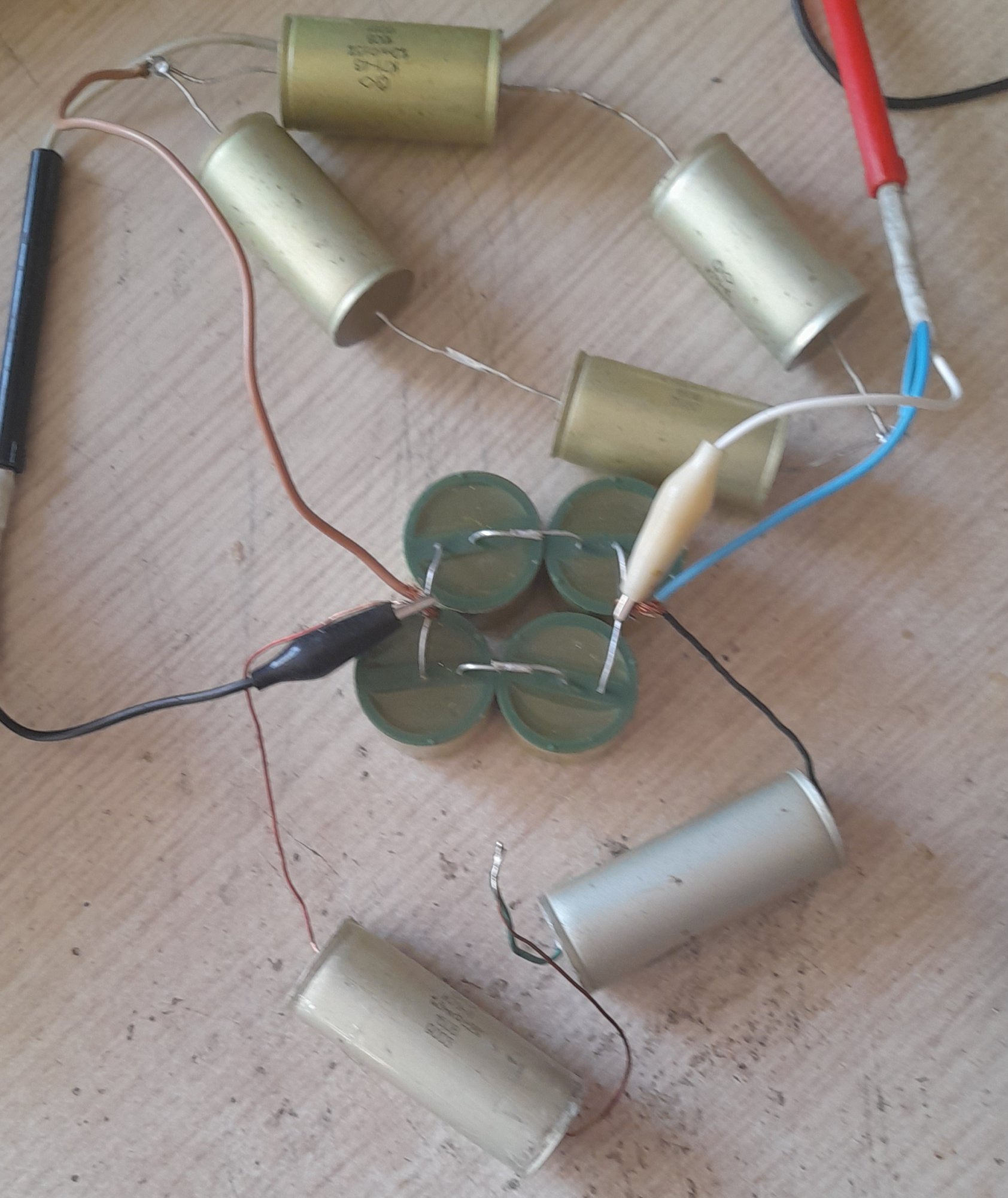 Прогрев контактов и переходов методом "пропускания переменного тока". Как сегодня выяснилось, к71-4 и к71-5 очень благожелательно относятся к такому прогреву. На фото 1 включенные попарно-последовательно 160 вольтовые конденсаторы на прогреве от розетки.
