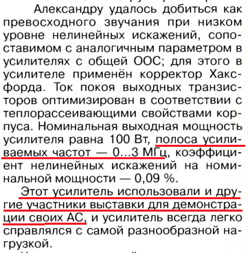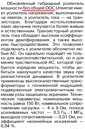 витамир, я не видел ни в одном обзоре хорошо звучащих усилителей разработки названных тобой компаний. Селф написал кучу книг по разработке, но так и не понял от чего на самом деле зависит качество звука. По высказыванию одного из представителей компании выпускающей высококлассные усилители в усилителях с ОООС время задержки прохождения сигнала должно быть близко к нулю, но это трудно сделать обеспечив устойчивость. Не можете делать такие усилители - тогда делайте безОСные!. В реальных усилителях с ООС время задержки прохождения сигнала со входа до выхода колеблется от 0,2 мкс до 5 мкс и более.