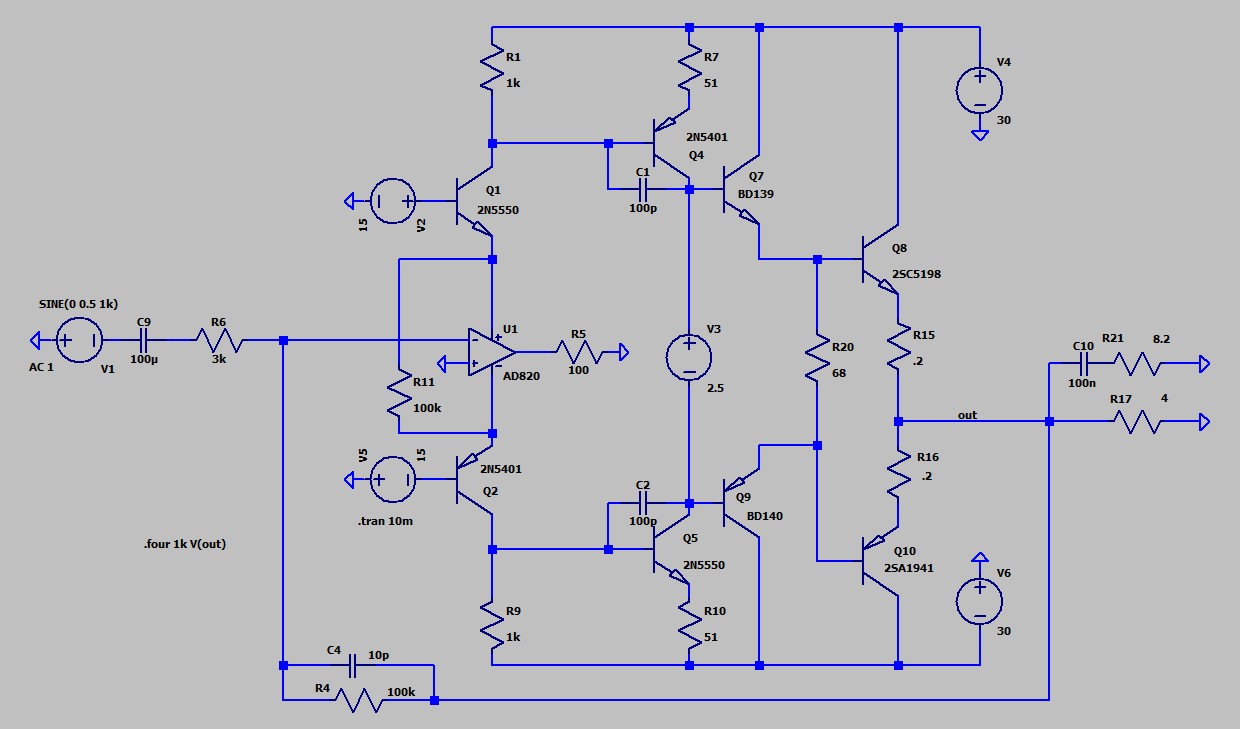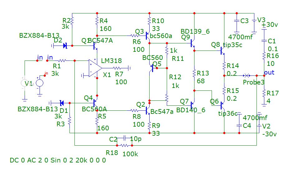 2> при выбранных номиналах отсутствует ток покоя усилителя напряжения и как следствие отсутствует ток покоя выходного каскада.