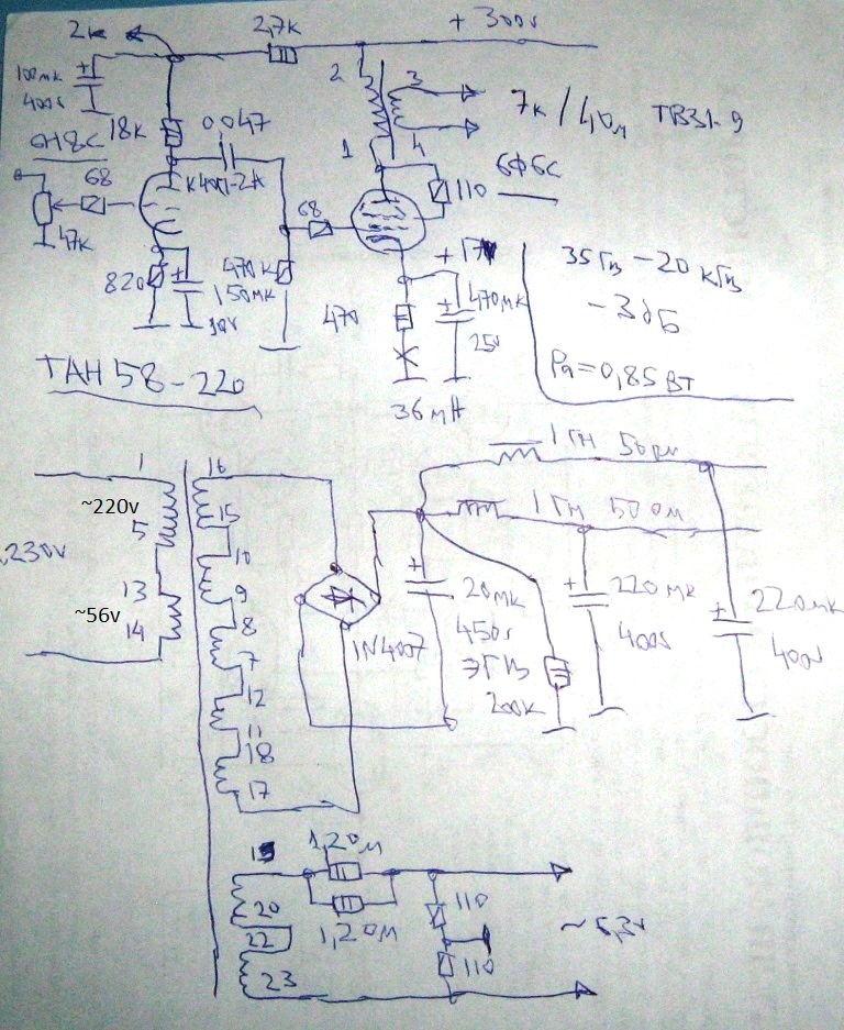 Я сделал ТАН58 так: первчика 1-5 и 13-14. Вторичка 16-15+10-9+ 8-7+12-11+18-17, получается =300в. Накал 19-20+22-23, резистор 5 вт и 0,6 ома, этот подбирать по току накала. Не гудит, зудит и пр.