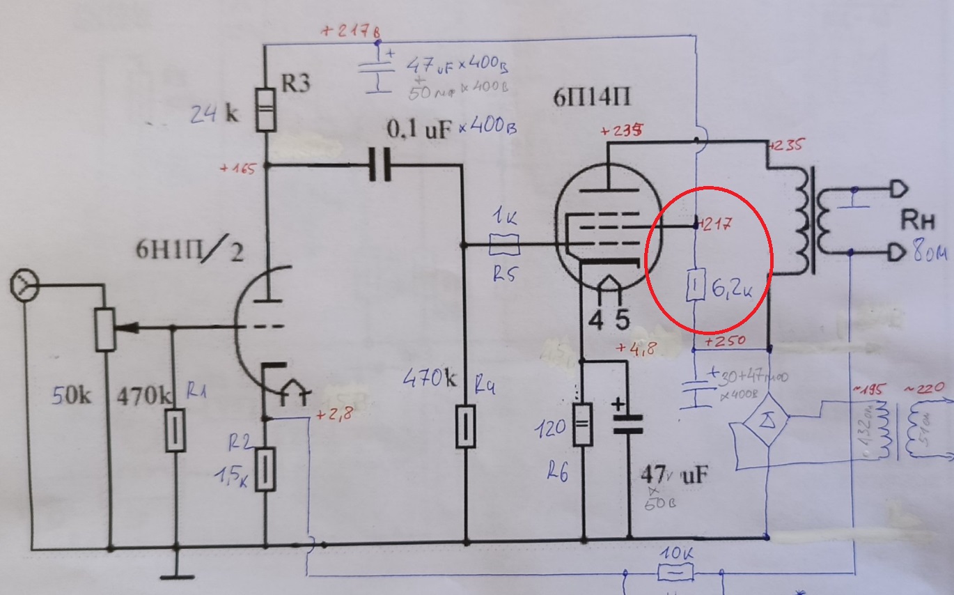 Поэтому - если и переходить на ток 5,6 мА - то никак не при напряжении 83В... это очень низкое напряжение. Гораздо лучше было бы те же 5,6 мА и при напряжении 160В на аноде. Но в этом случае - не обойтись без изменения анодного резистора. Попробуйте его (резистор анодный) посчитать (рабочая точка 5,6мА, 160В).