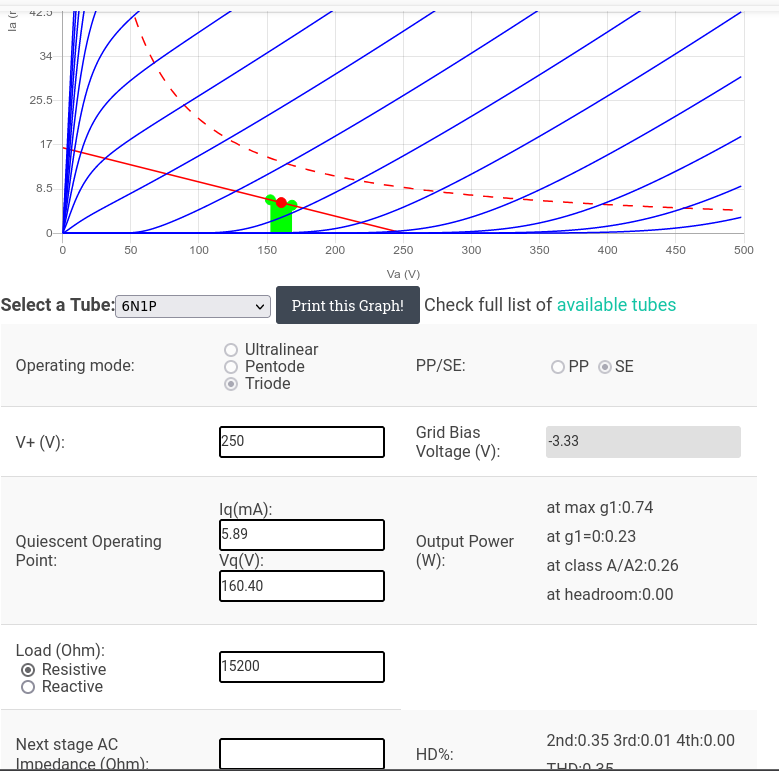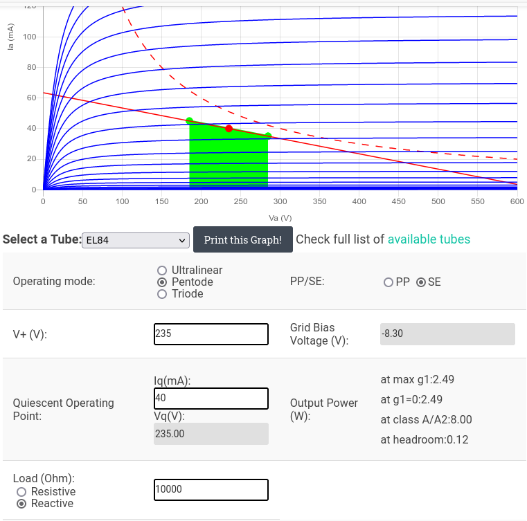 Пересечение красной и зелёной линии - рабочая точка. У меня она получилась - примерно 170В на аноде, при смещении примерно 4,5В.