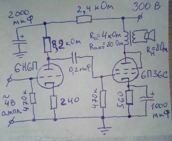 могу сразу сказать , что и первый и второй каскад построен на автосмещении. еще могу отметить, что драйвер включен в режиме триода, а выходная лампа в пентоде. судя по амплитуде входного сигнала, чувствительность усилителя не большая. Когда буду строить график первого каскада, расчитывать буду Ra = 2,4+8,2=10,6 кОм.без построения графиков, пока больше не скажу ничего, разве что мощность на аноде выходной лампы больше предыдущего случая примерно в 1,7 раза. (напряжение почти накое же, а Ra первички выходного транса 4к, против почти 7 для 6С4С, следовательно и ток пойдет в 7/4 раза больший)